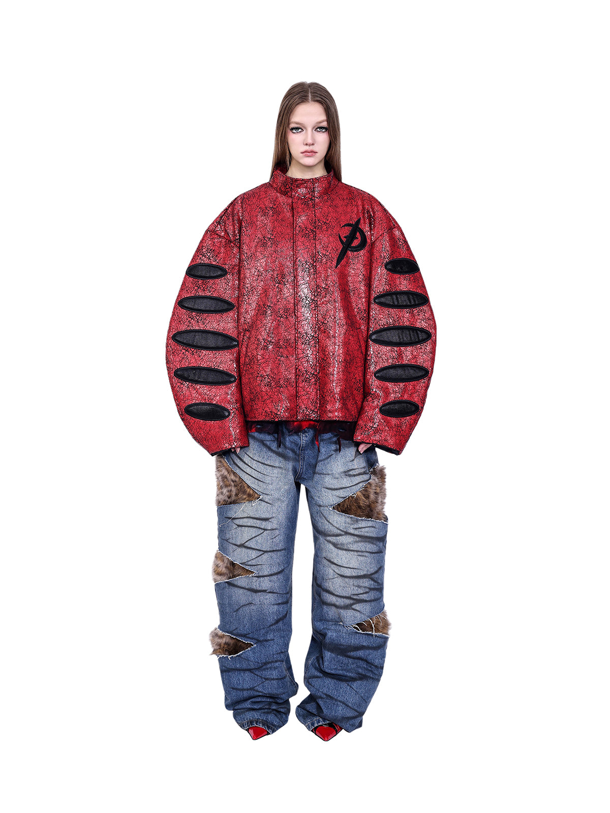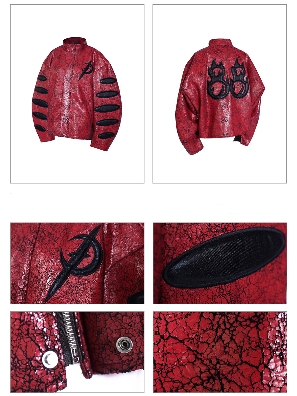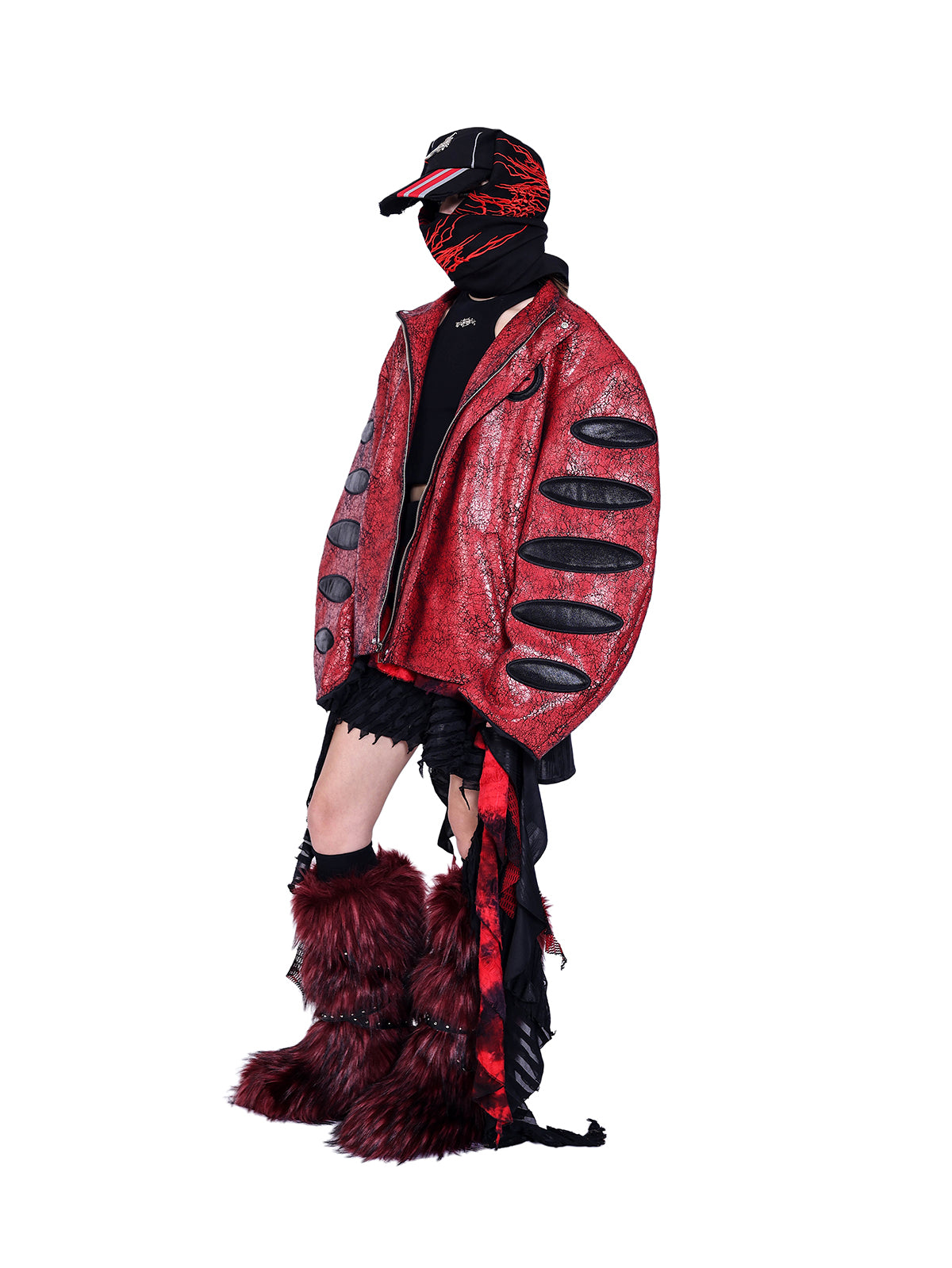赤と黒のダメージ加工されたPUレザーバイカージャケット