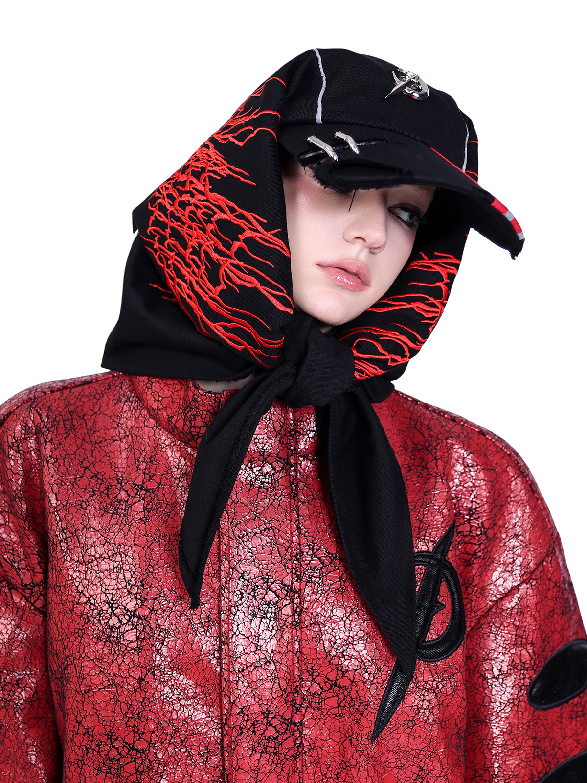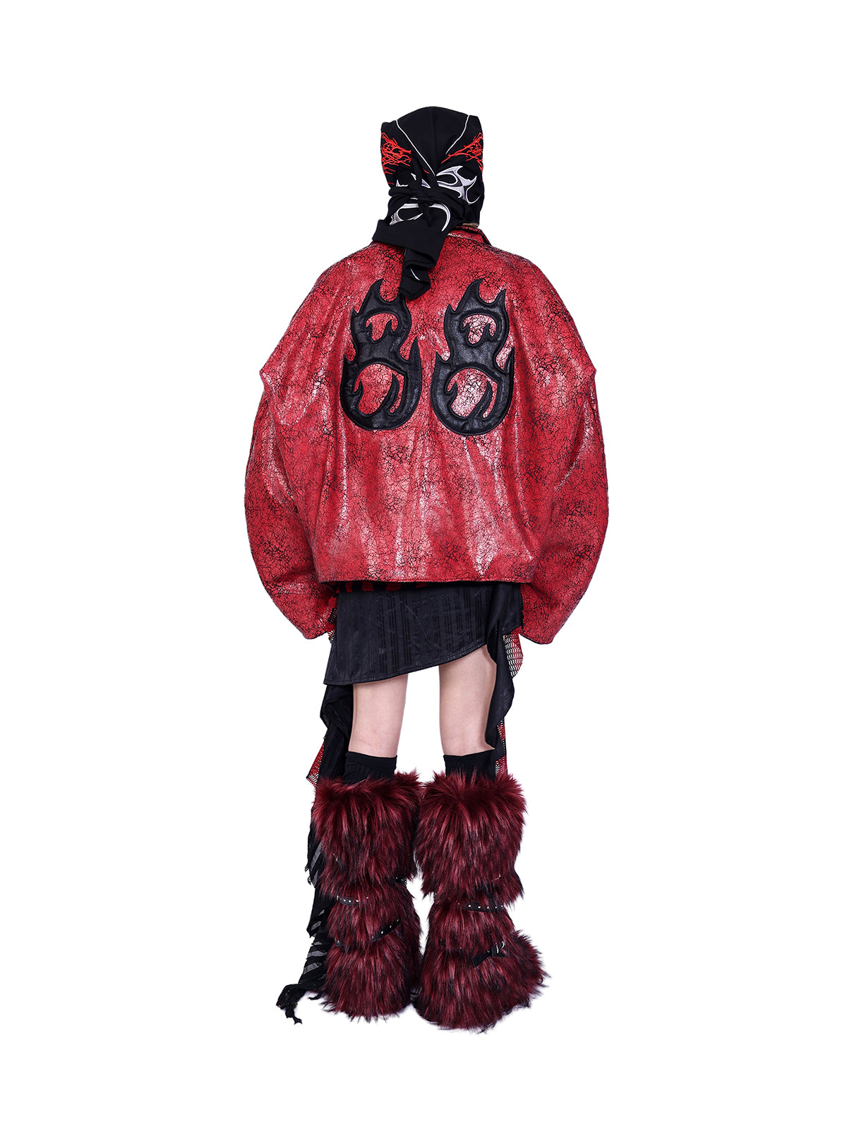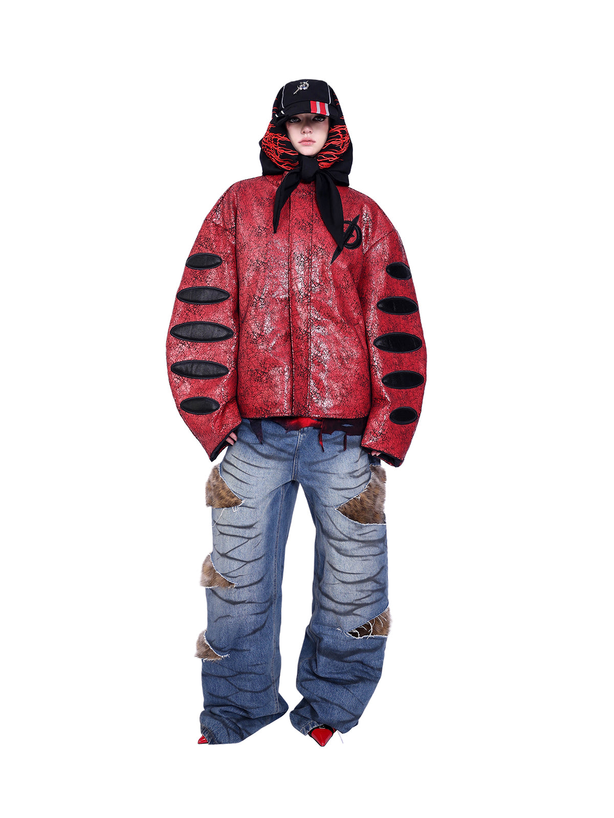 赤と黒のダメージ加工されたPUレザーバイカージャケット