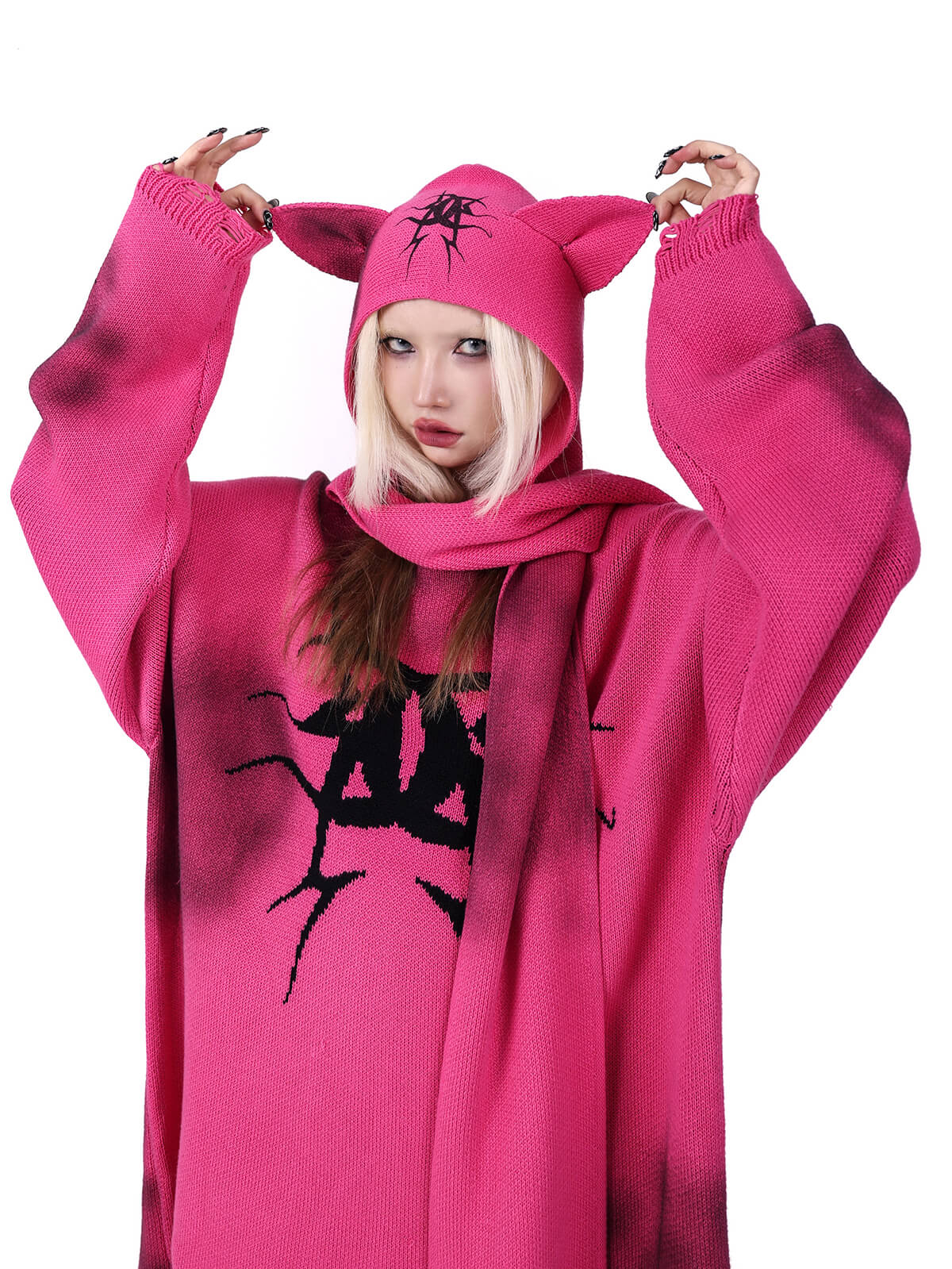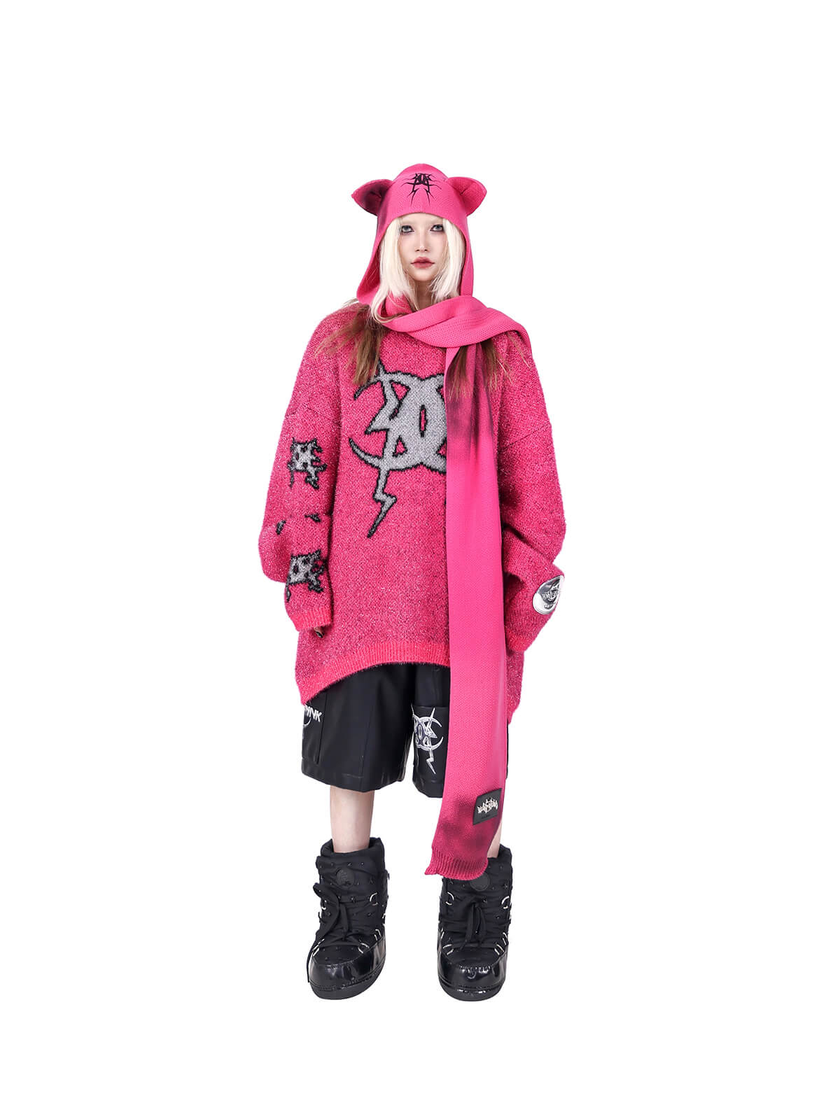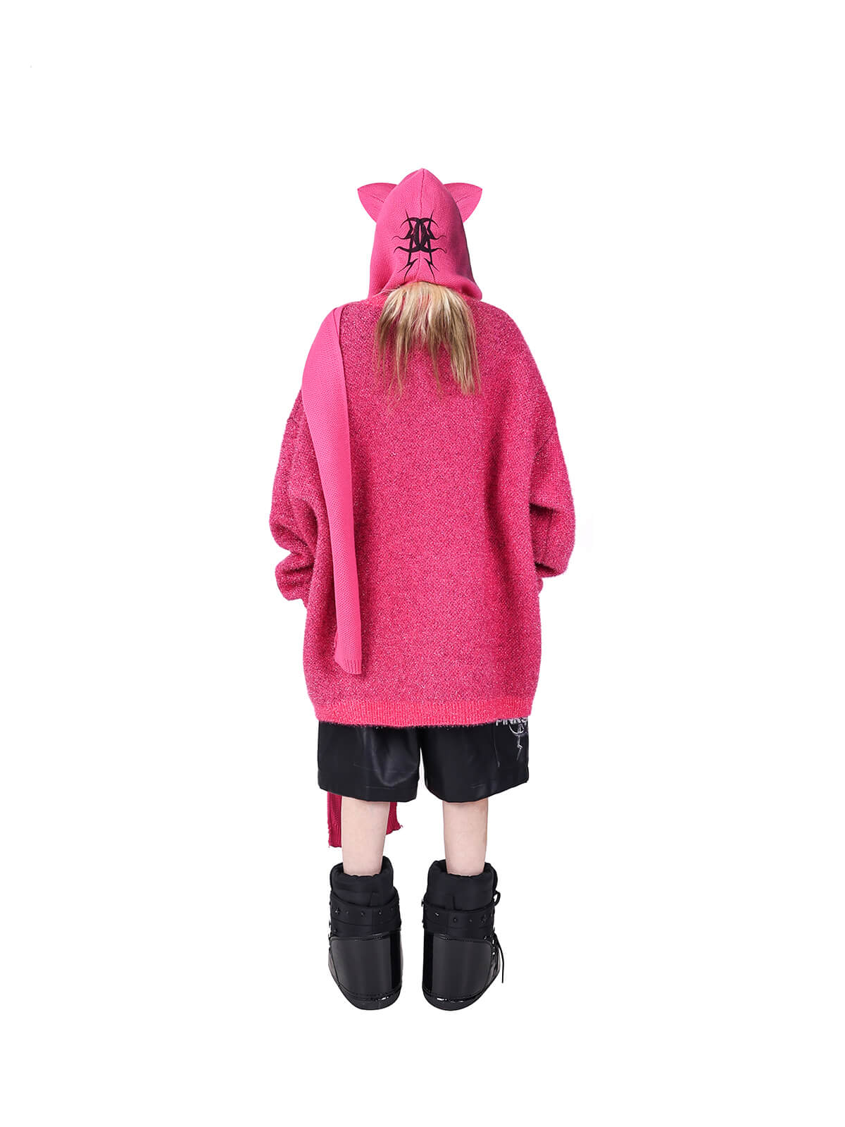 サイン入りの猫耳デザインのニットフードスカーフ。