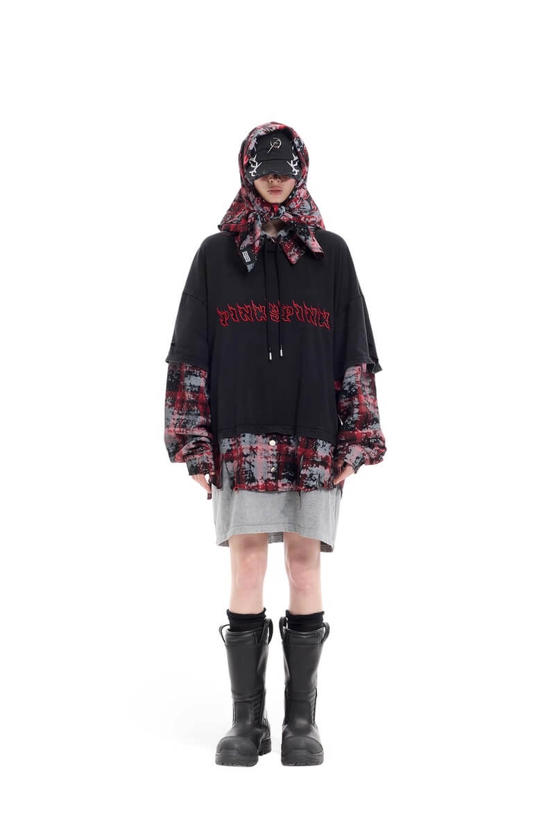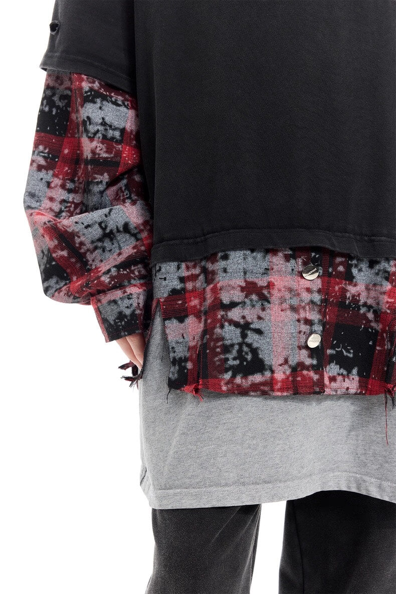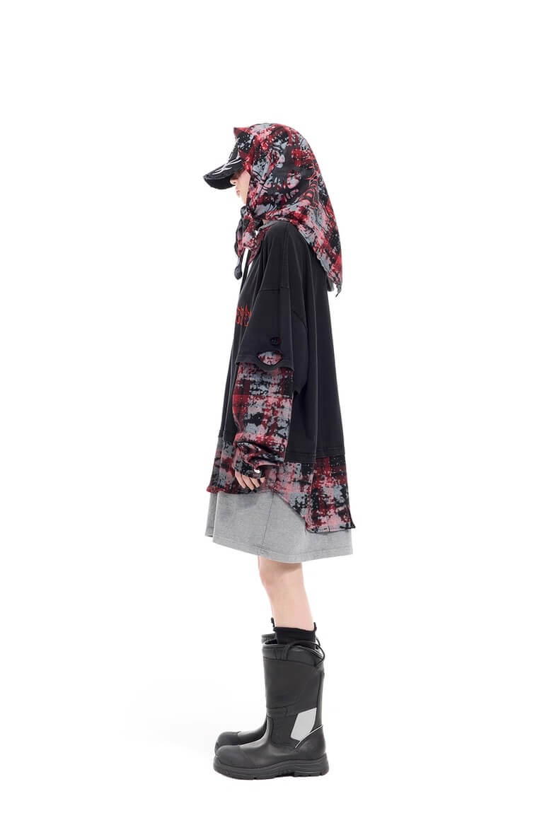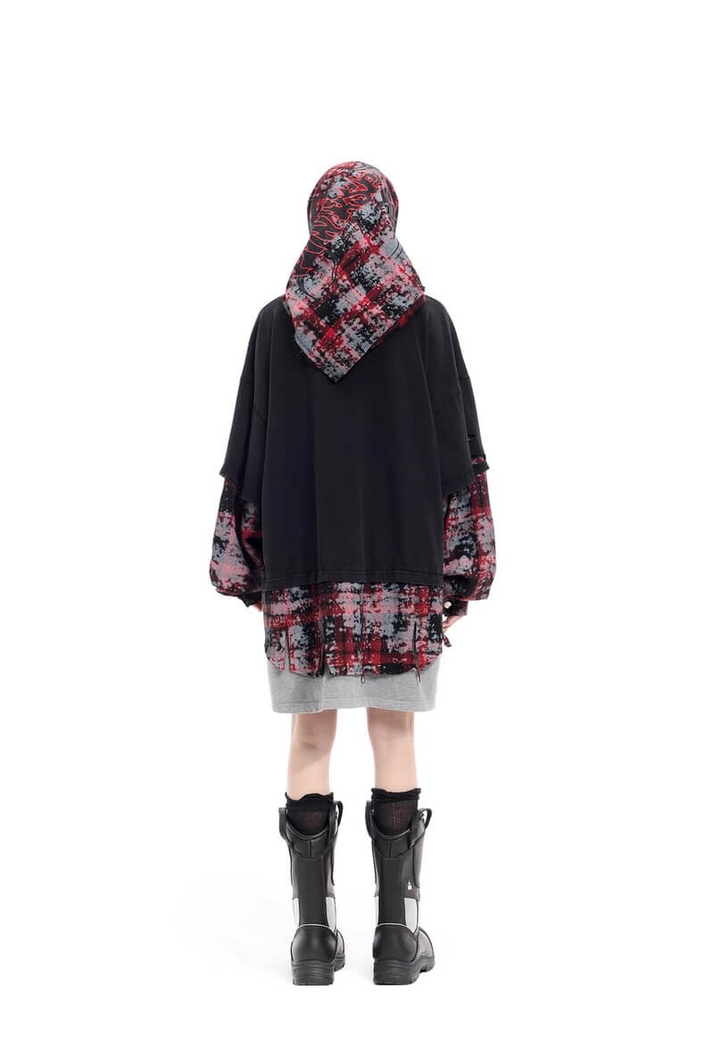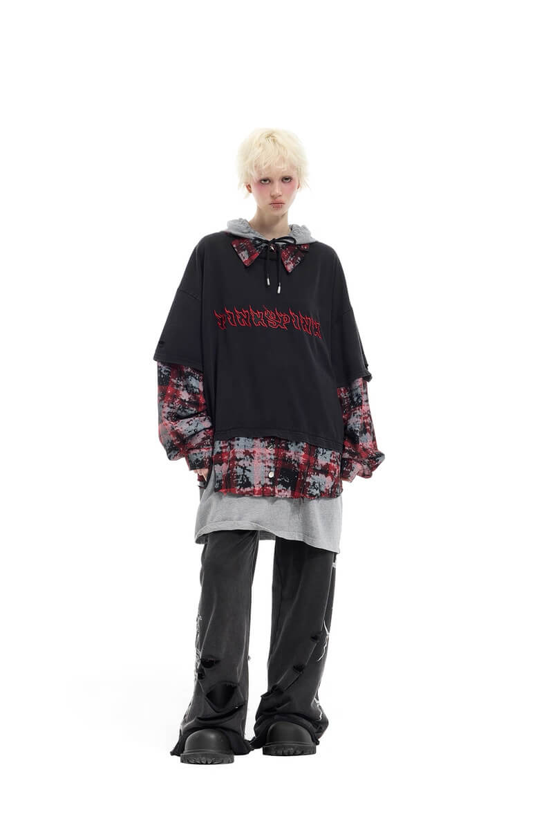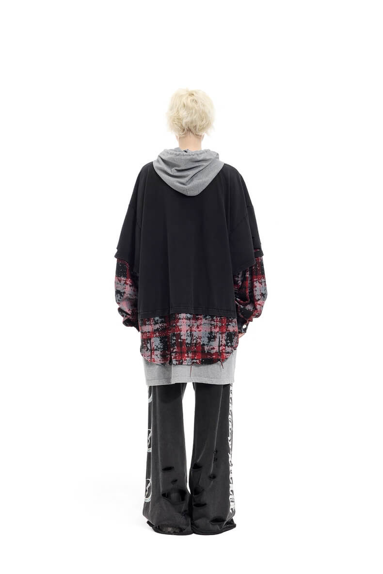 - Three layers: distressed tee, tie-dye plaid shirt and oversized grey hoodie — all worn as one piece