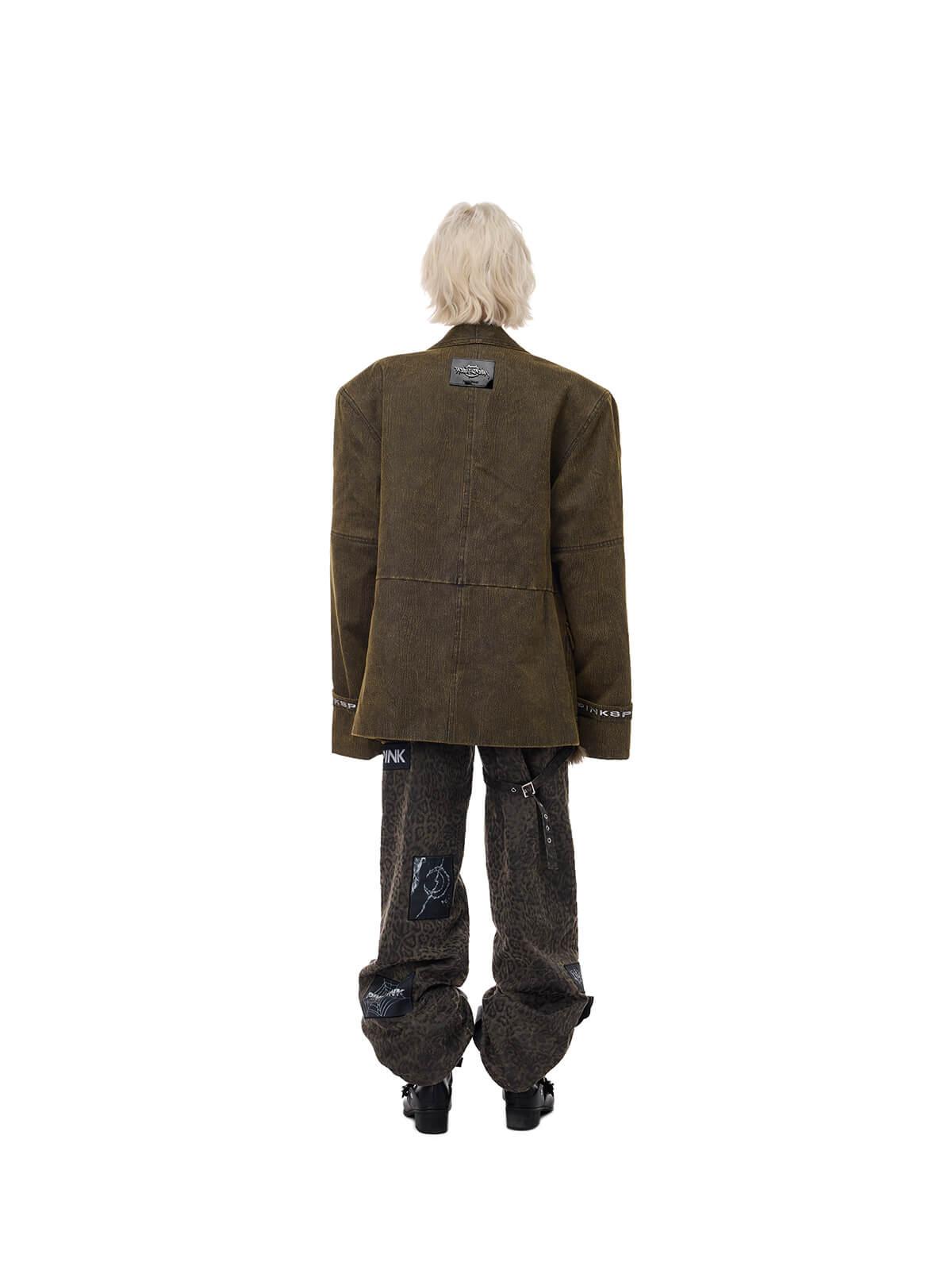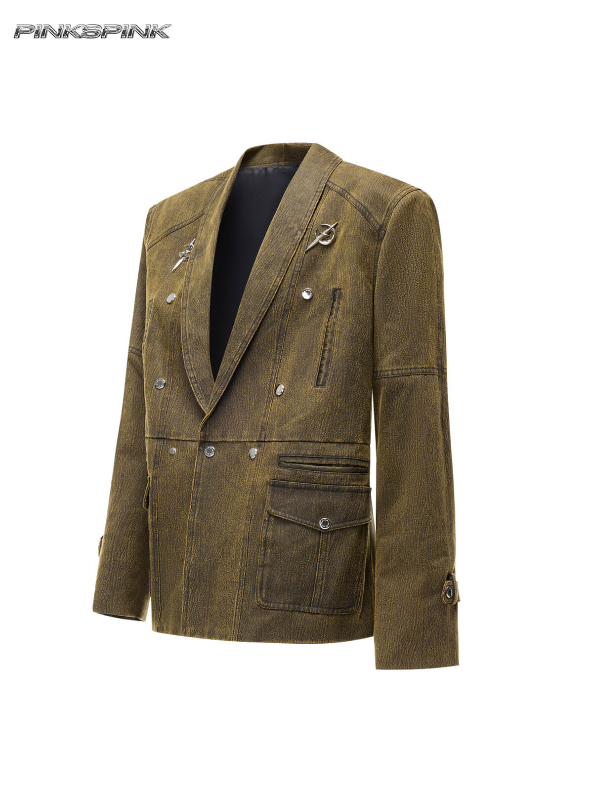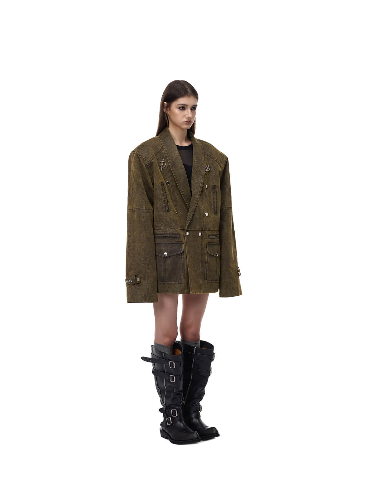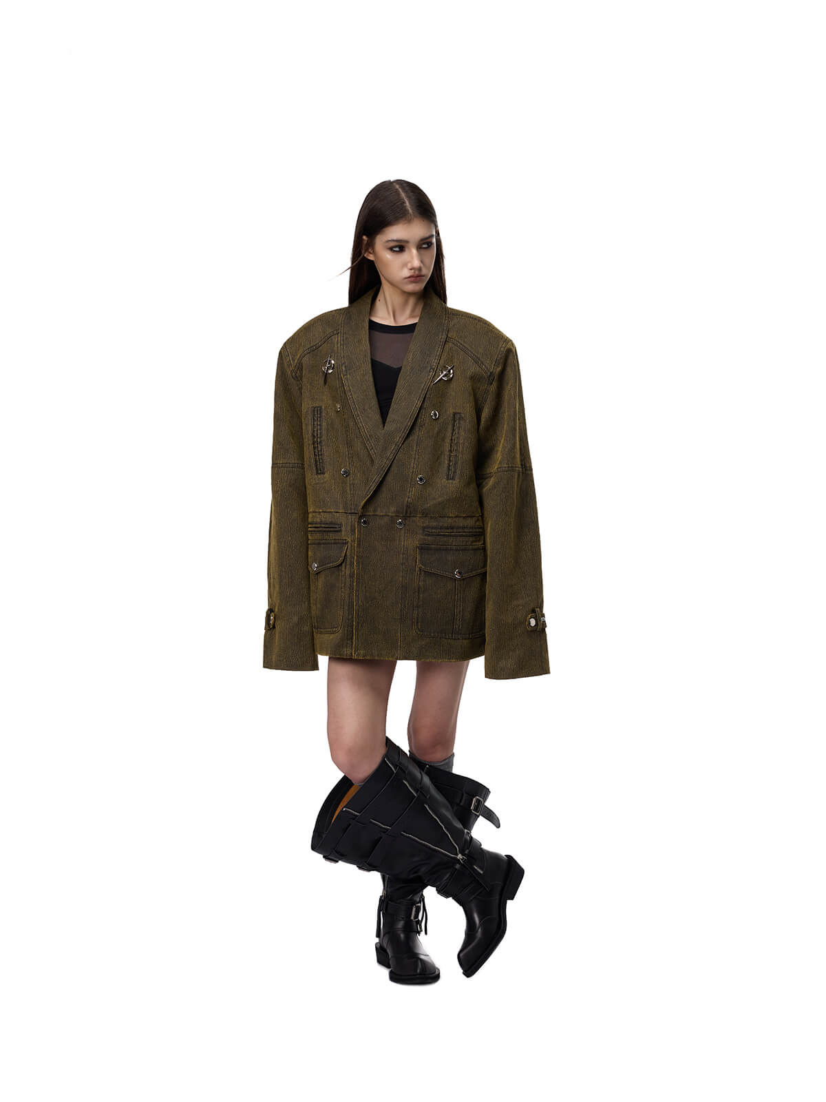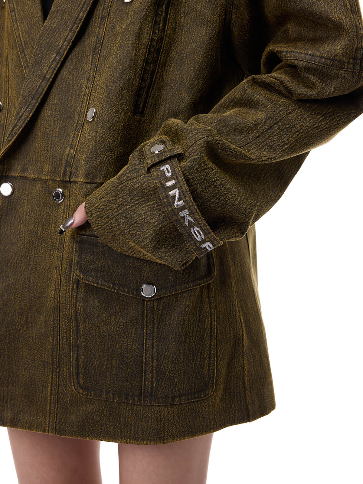レトロなミリタリー効果のダメージ加工カーキブレザー
