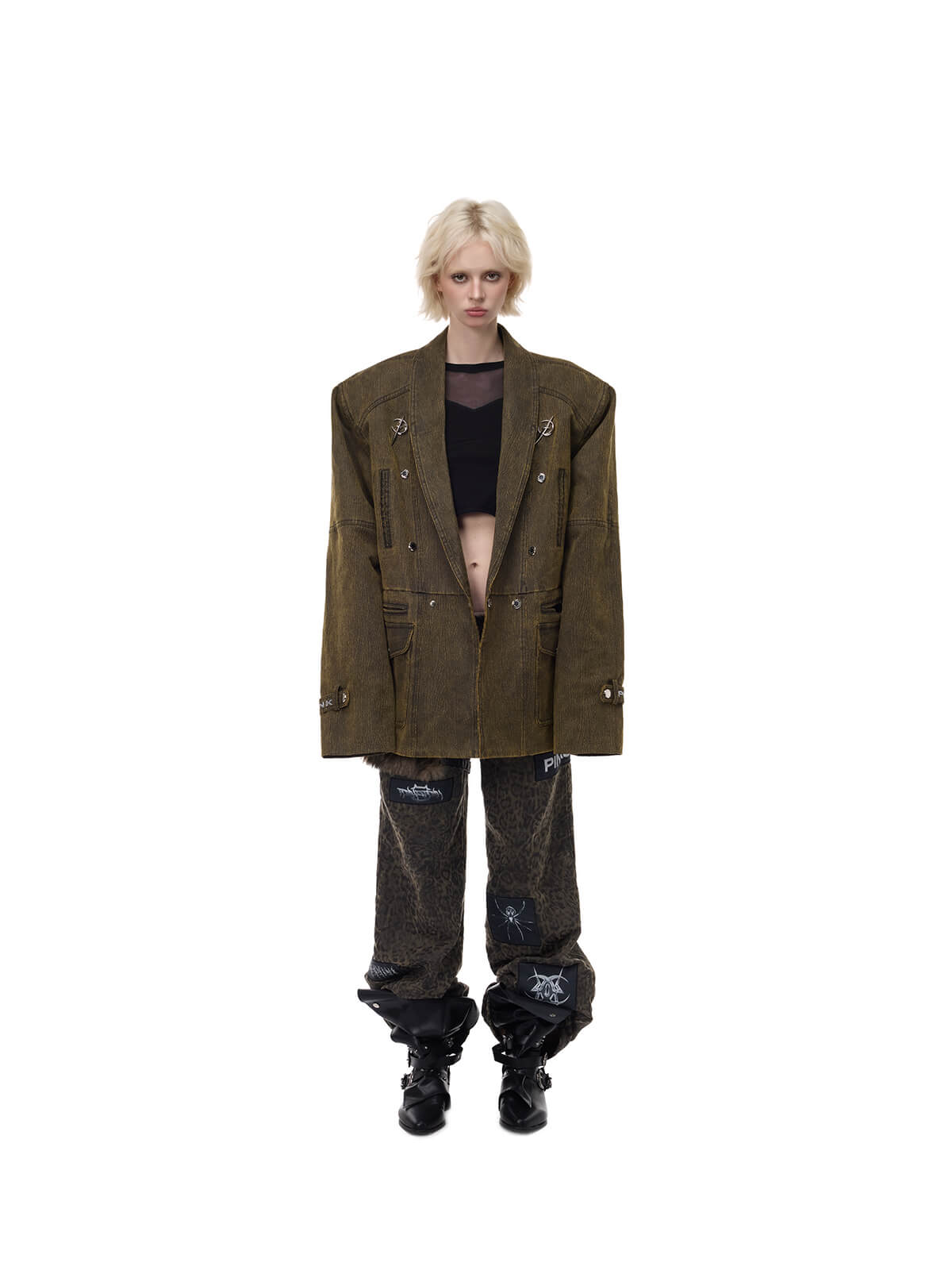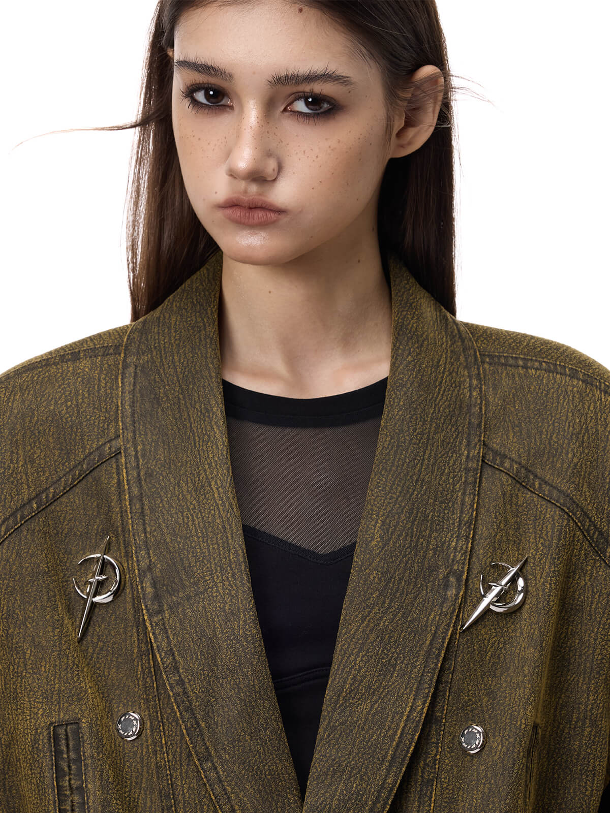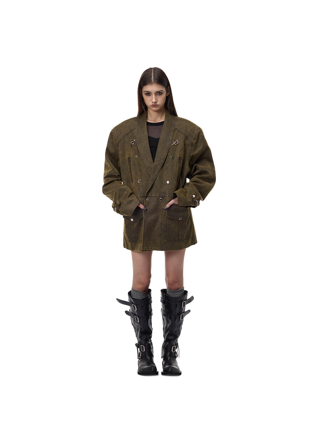 • 広く間隔をあけたメタルボタンのダブルブレスト風デザイン