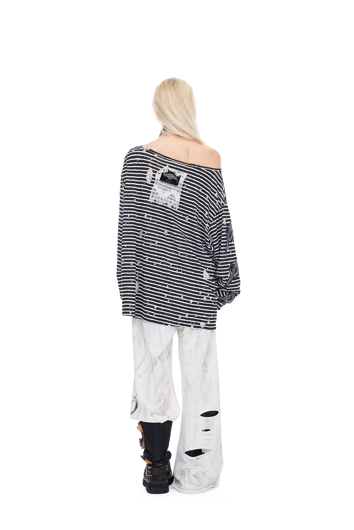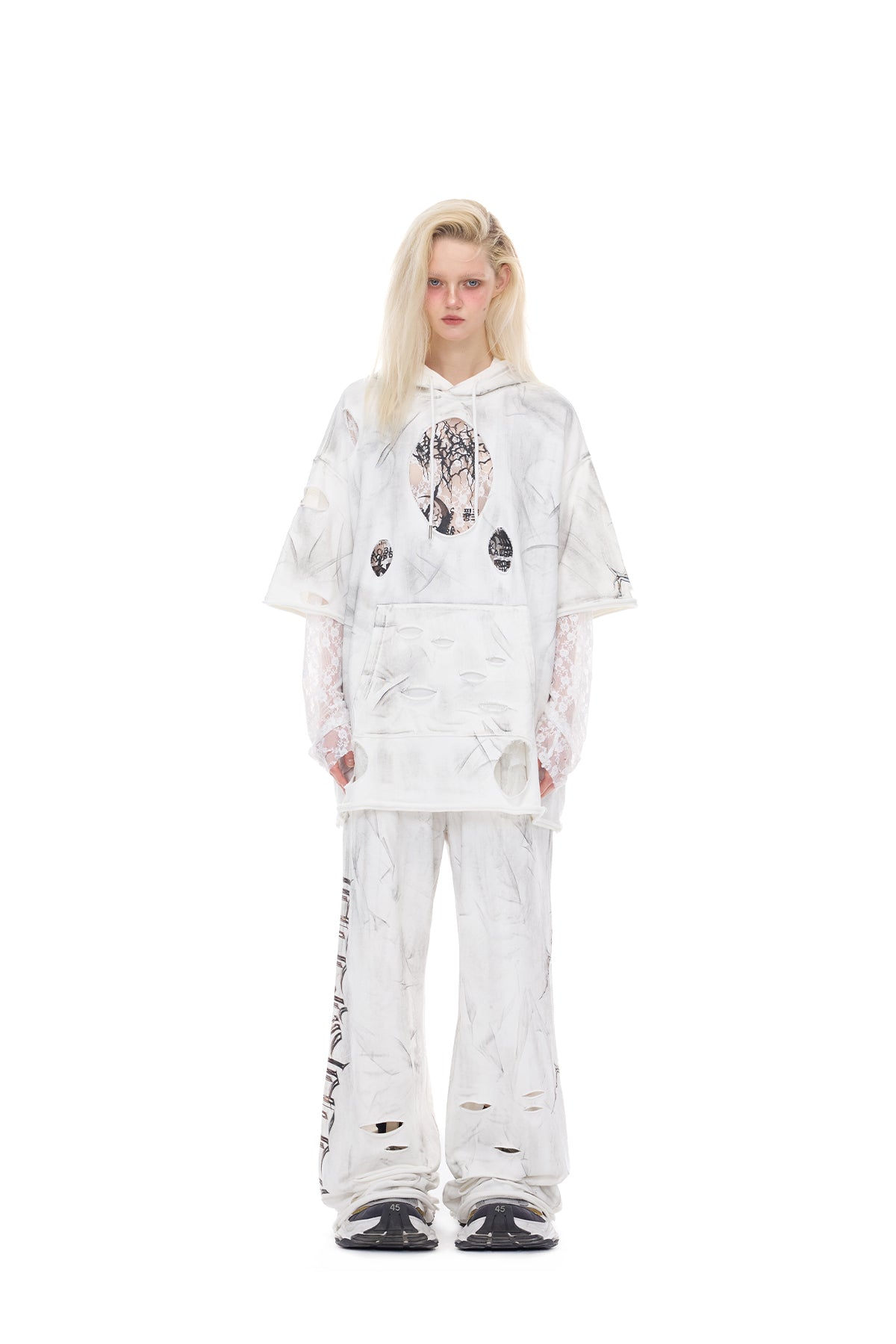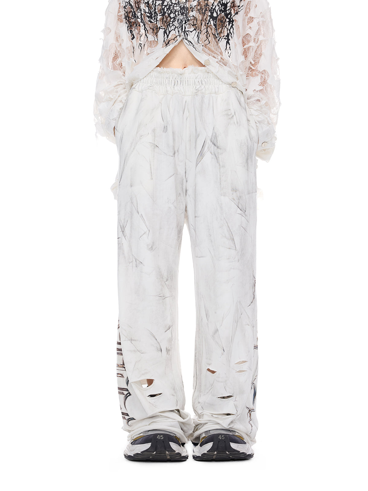 リラックスフィットのスウェットパンツ、ダメージ加工付き