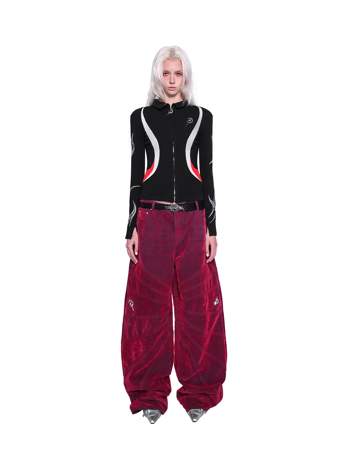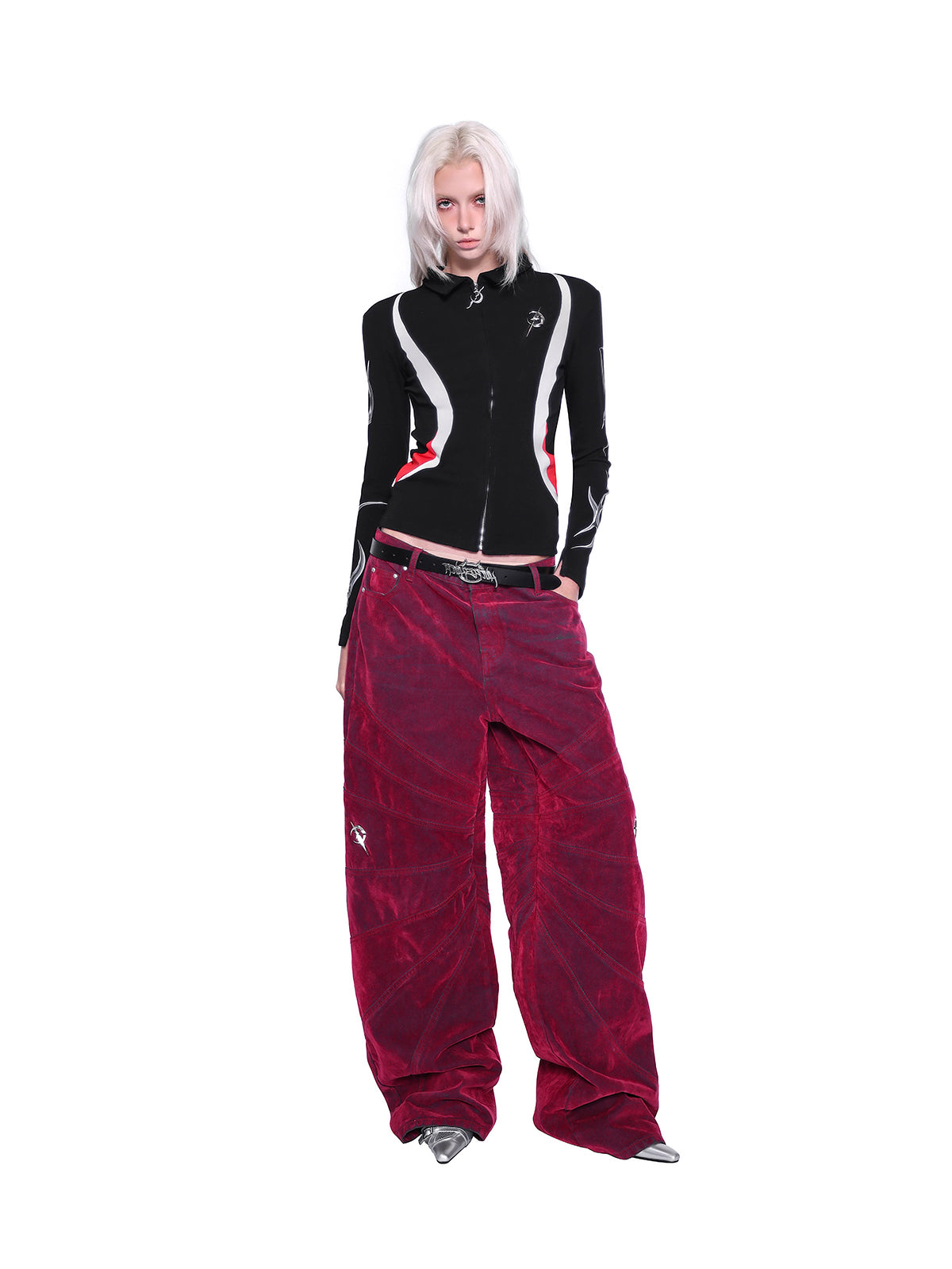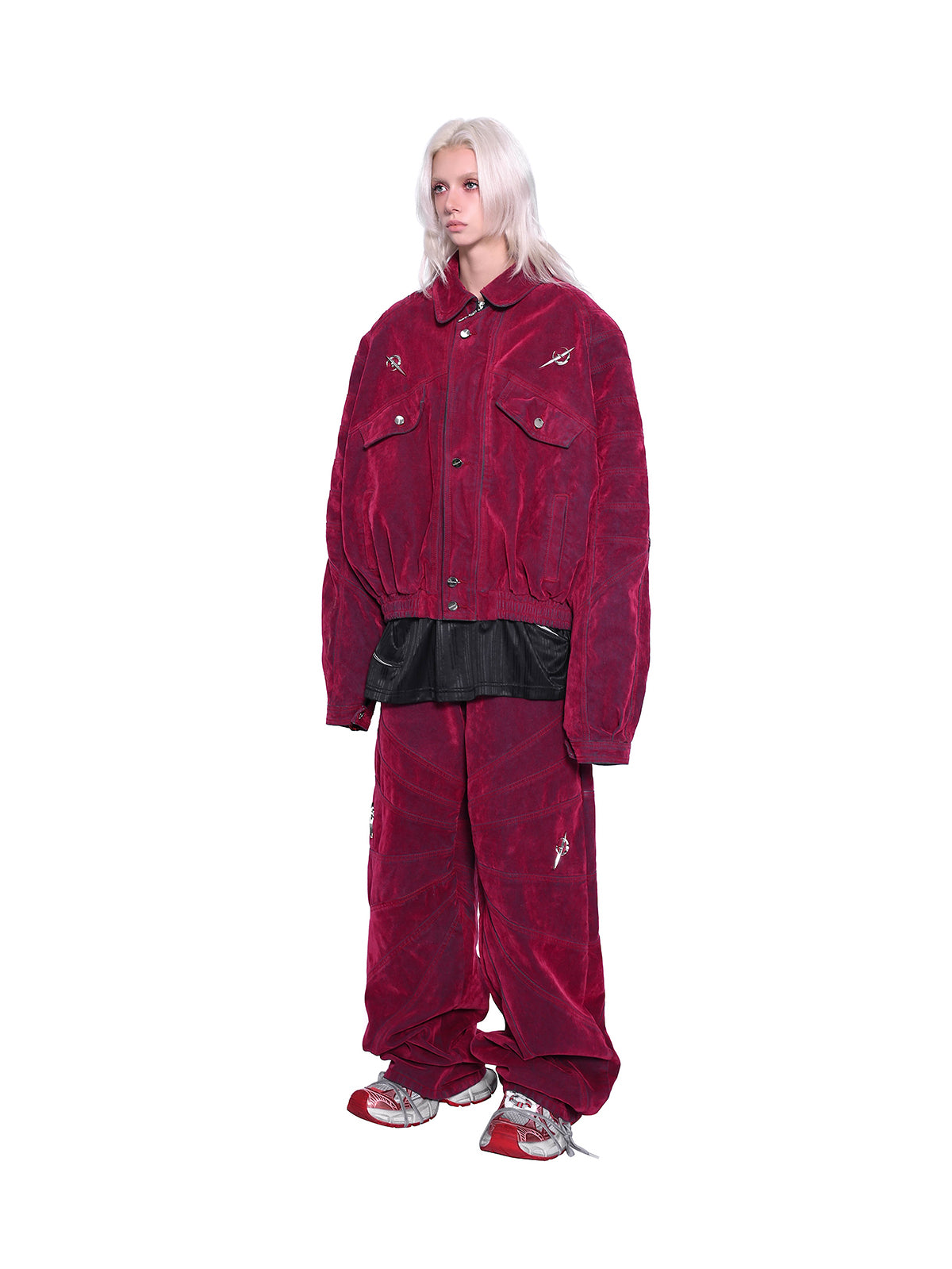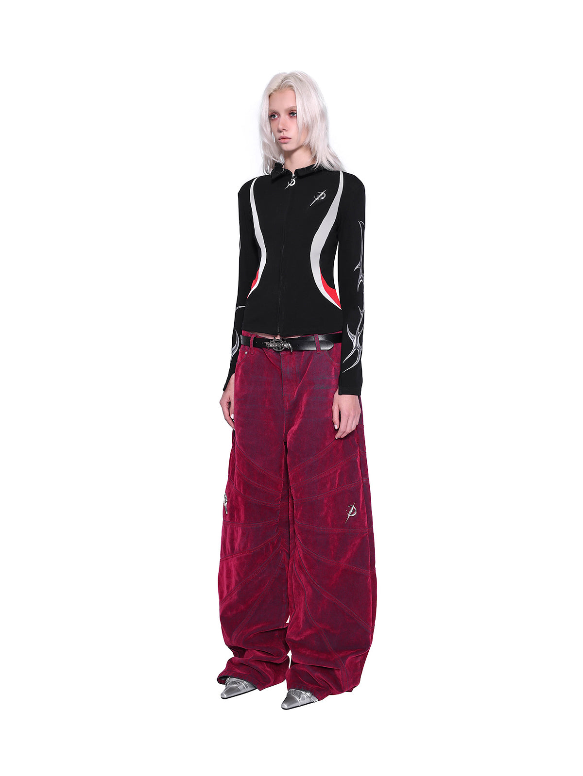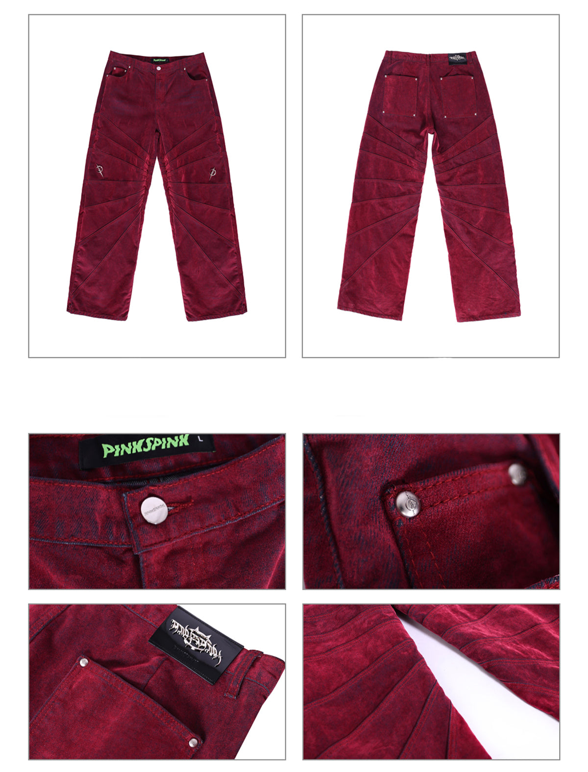 - 膝の位置にメタルブランドロゴのディテール