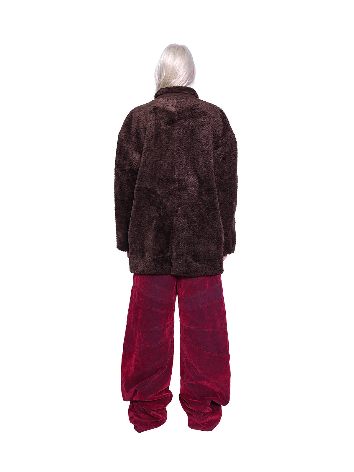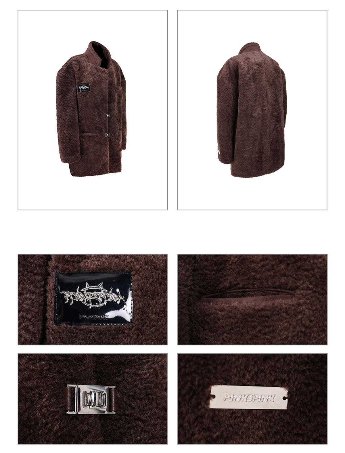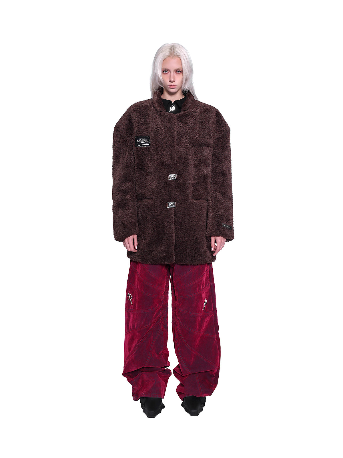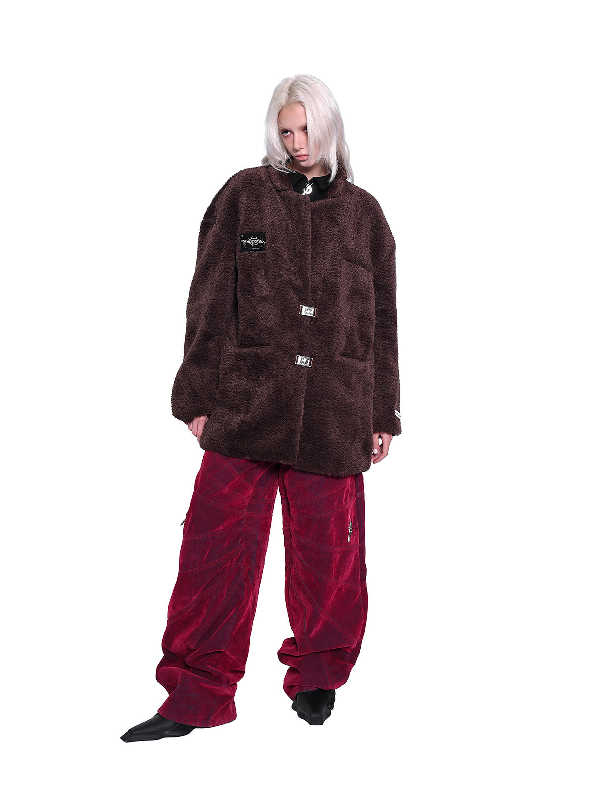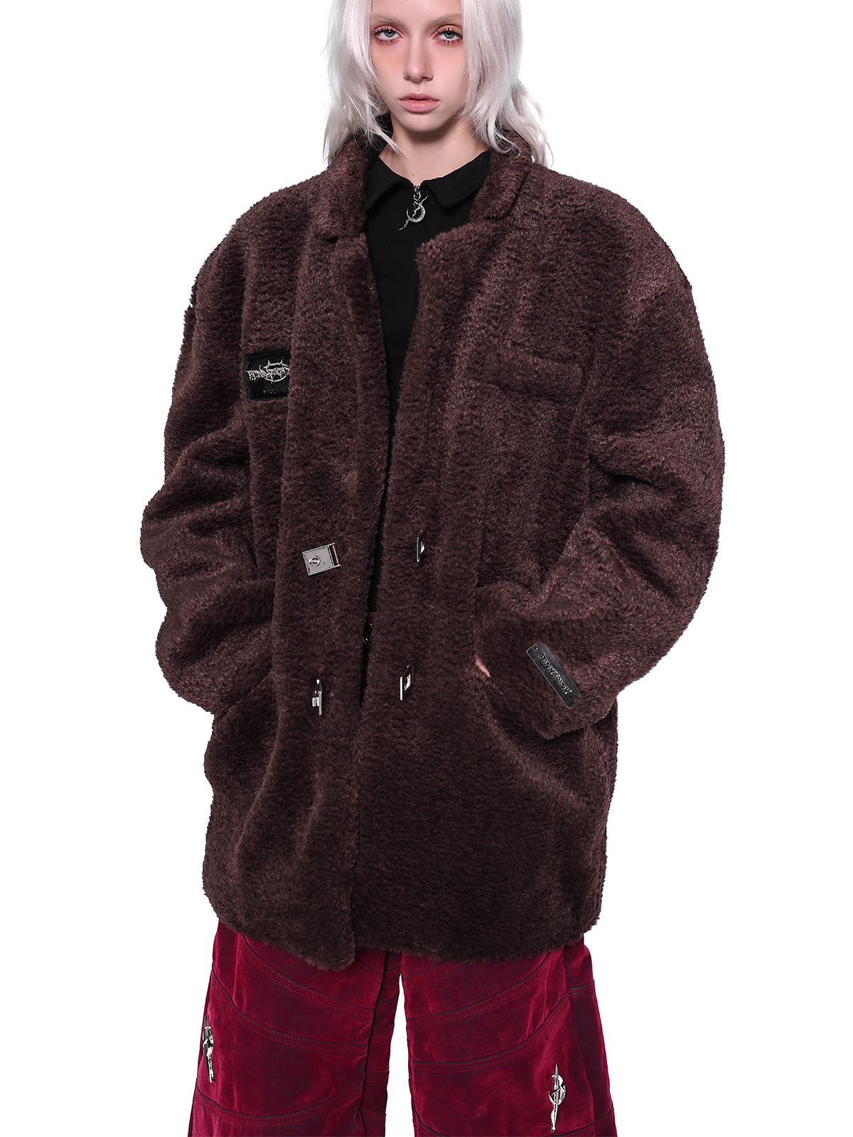 暖かい裏地付きのショートパイルテクスチャー生地のオーバーサイズキャラメルコート。