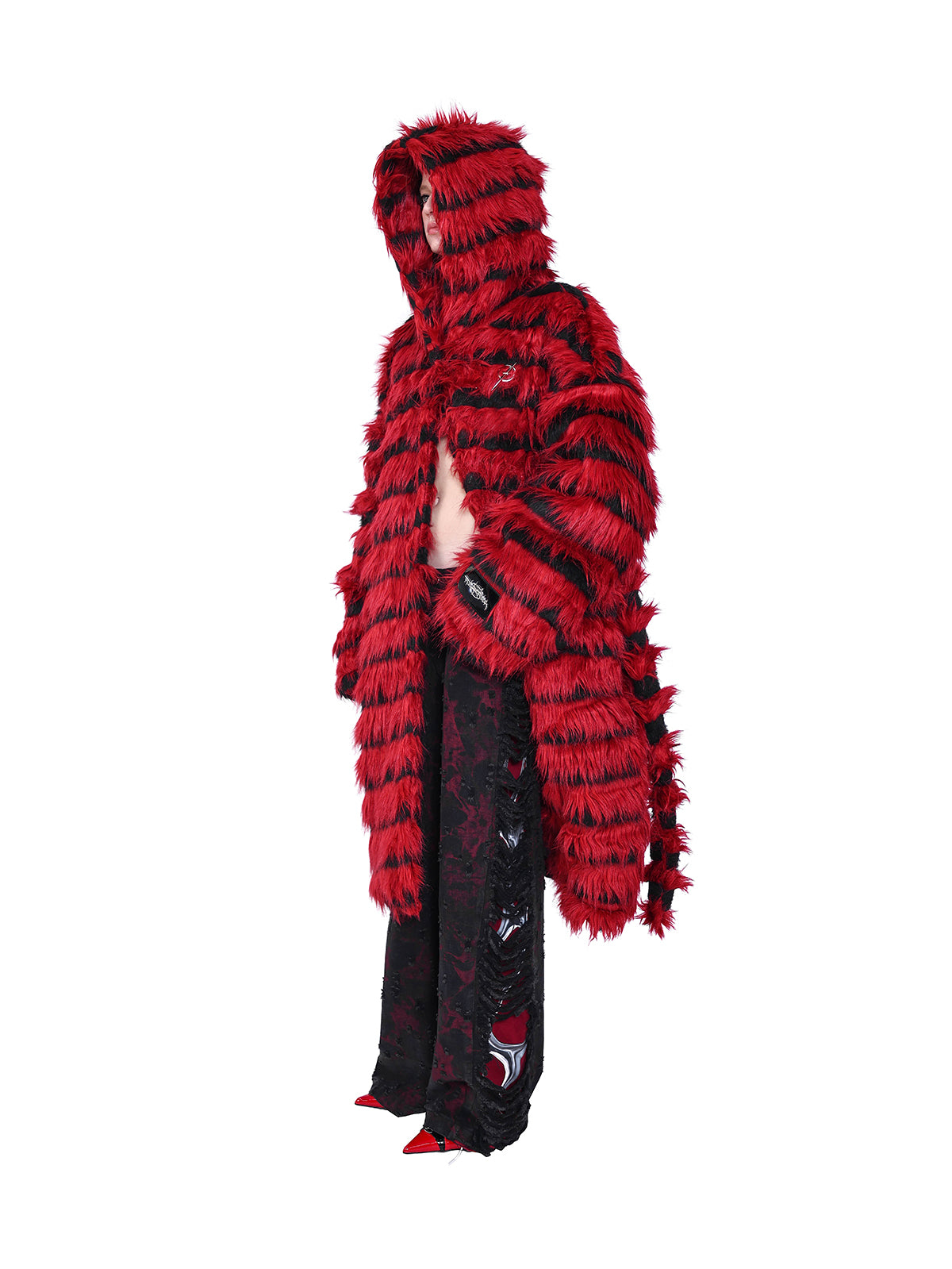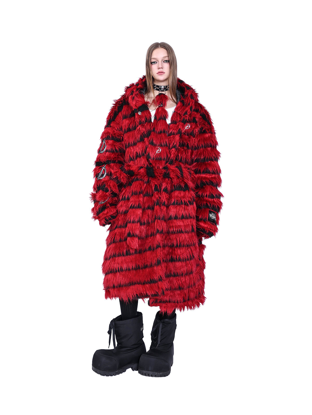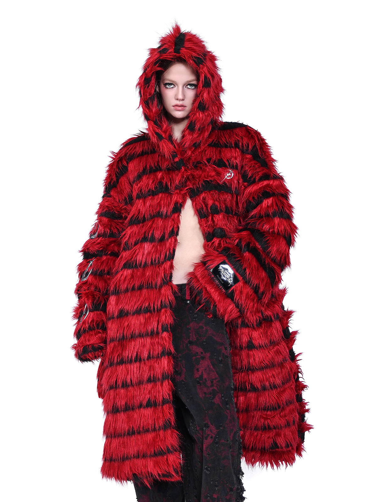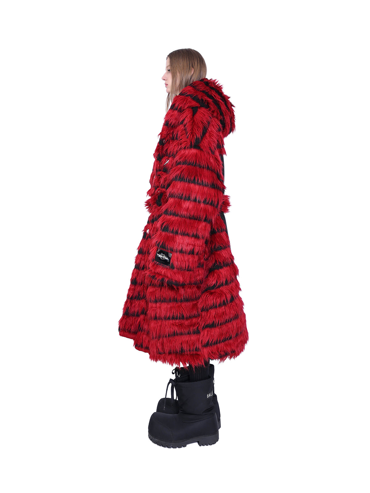 オーバーサイズの黒と赤のストライプのフェイクファーコート