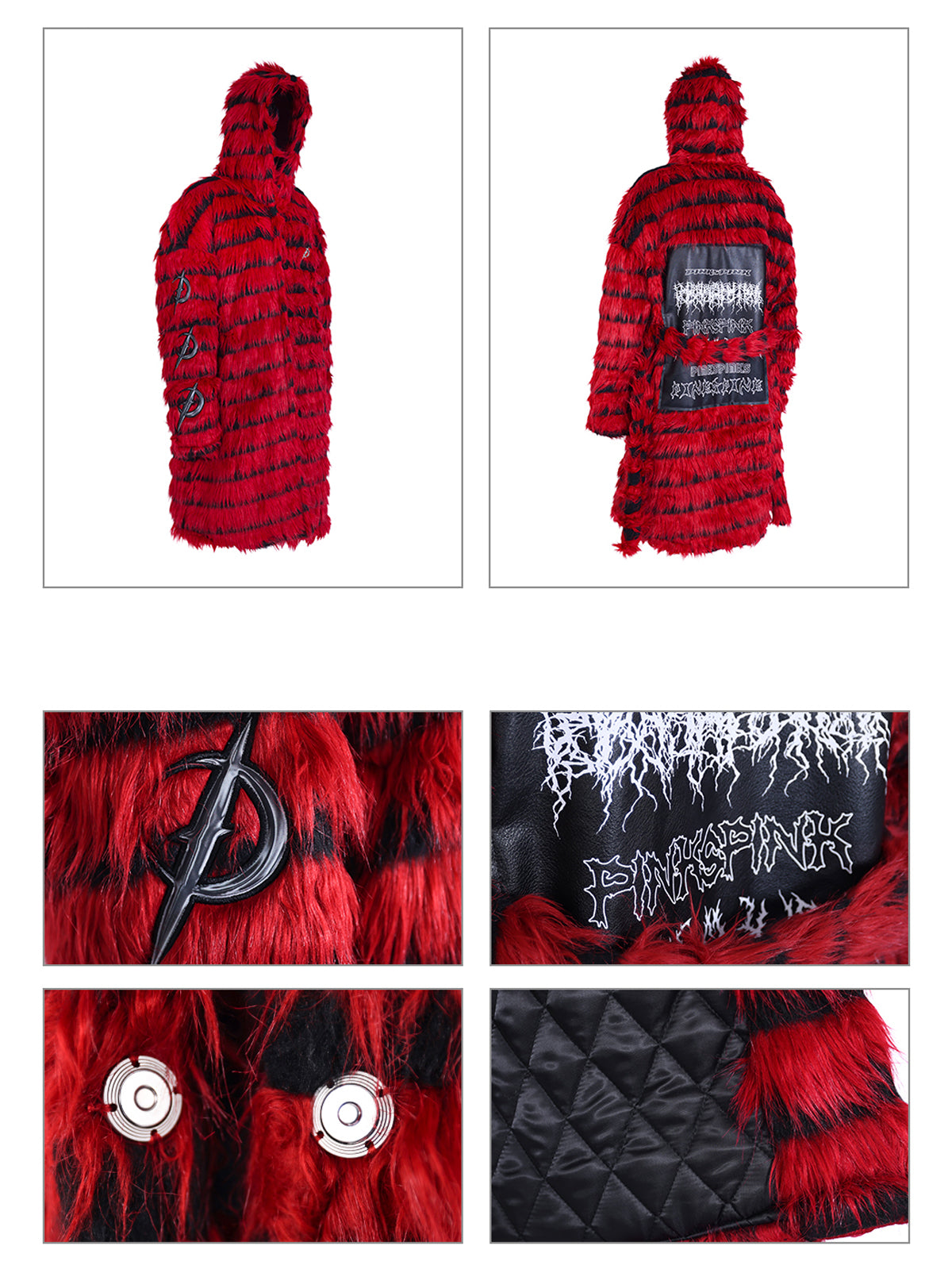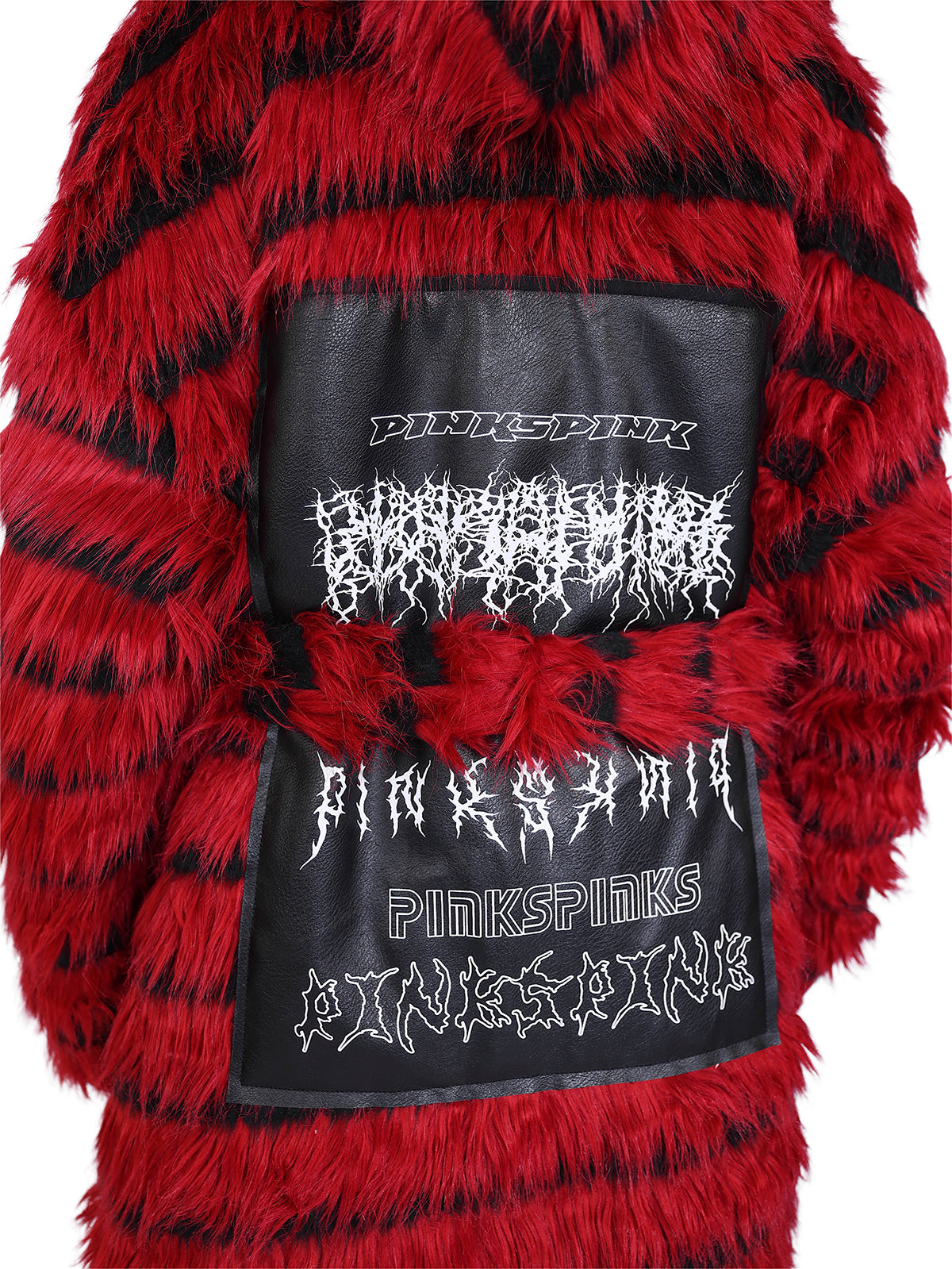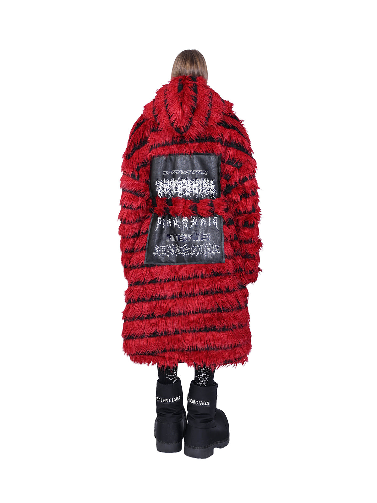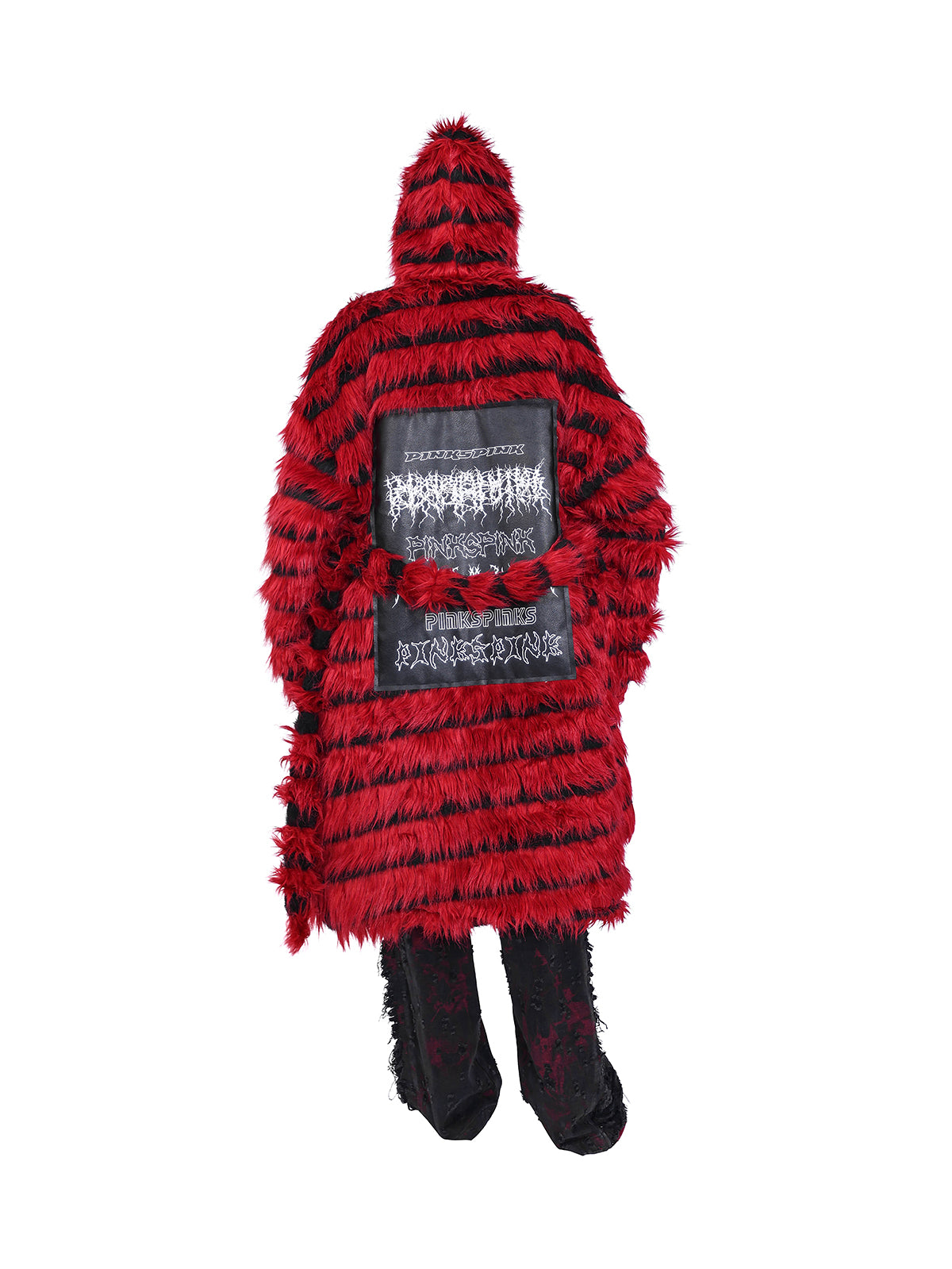 オーバーサイズの黒と赤のストライプのフェイクファーコート