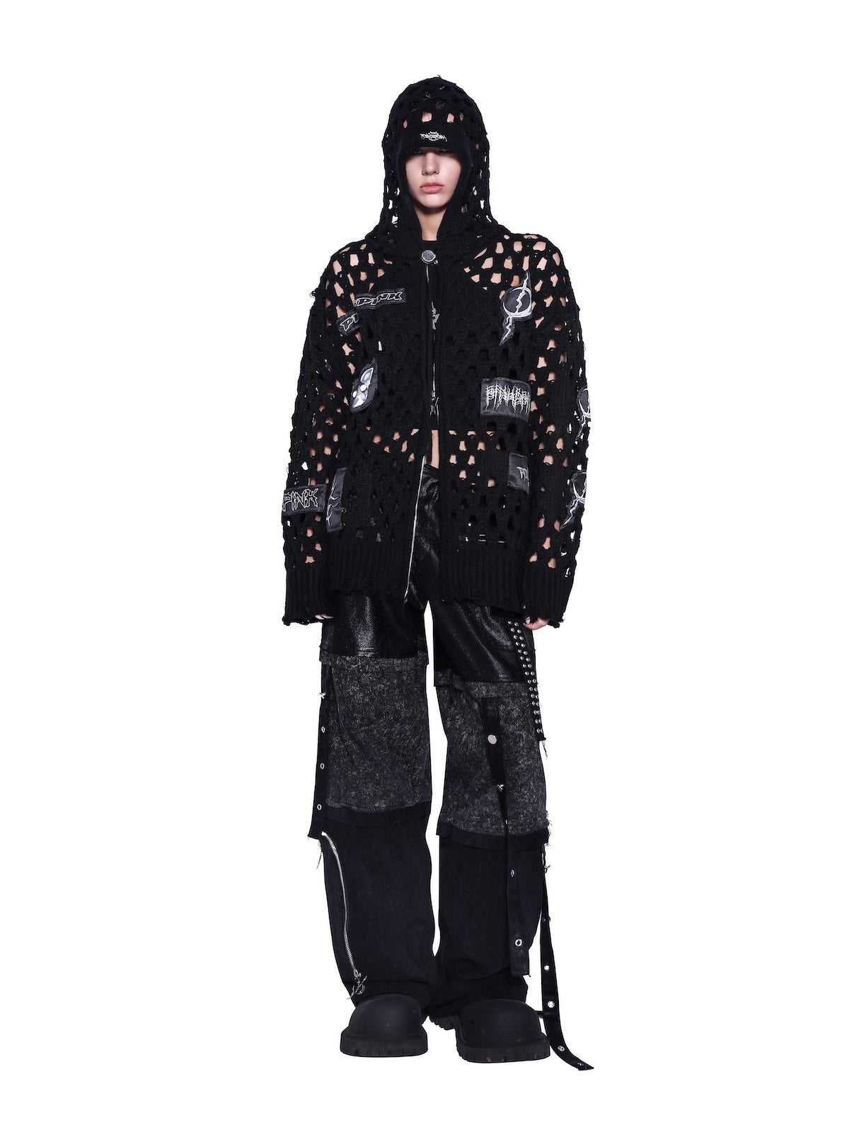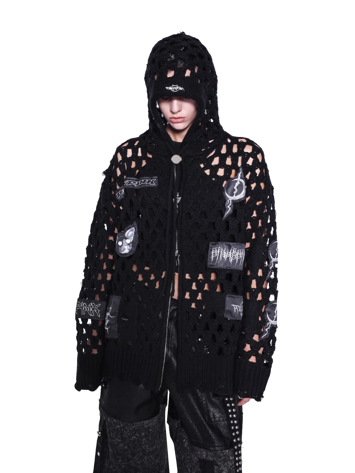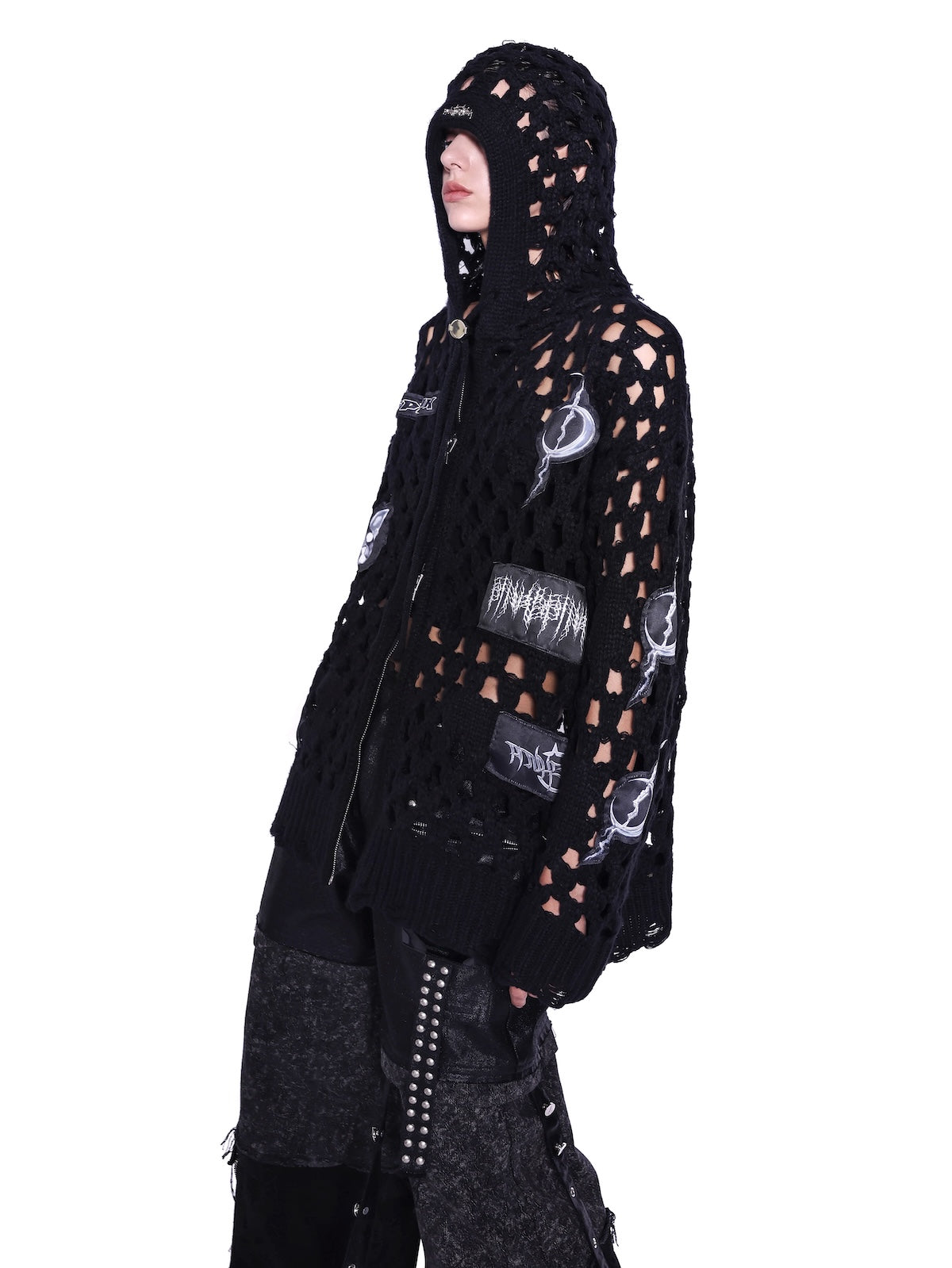 パッチワークの太めのニットフーディ