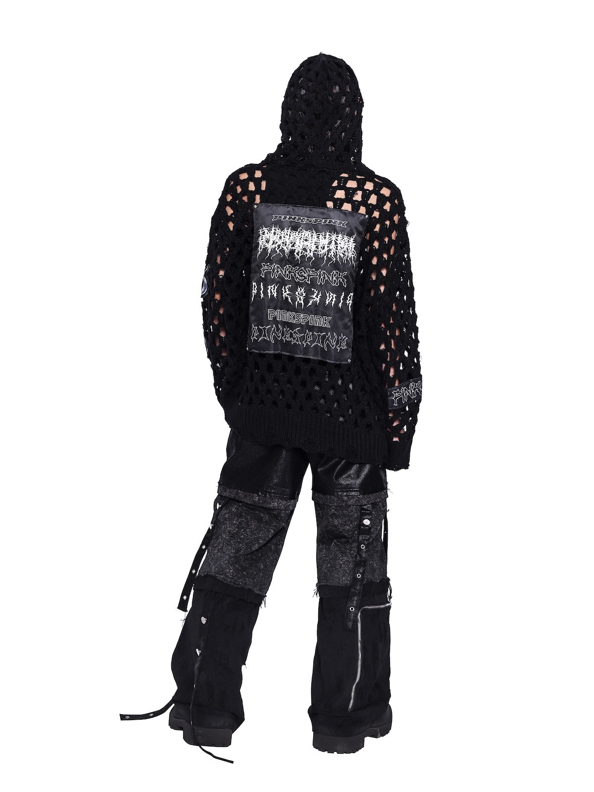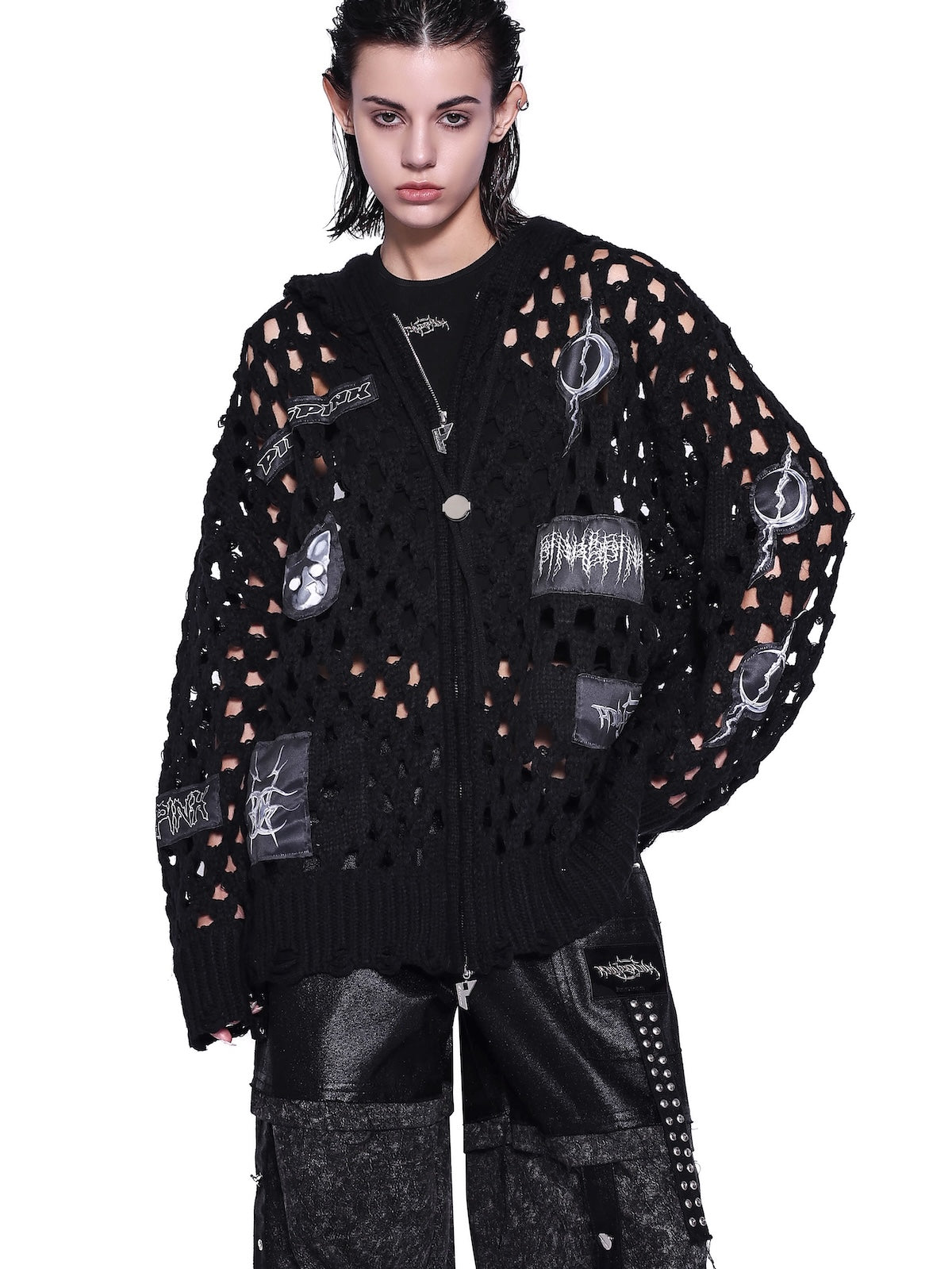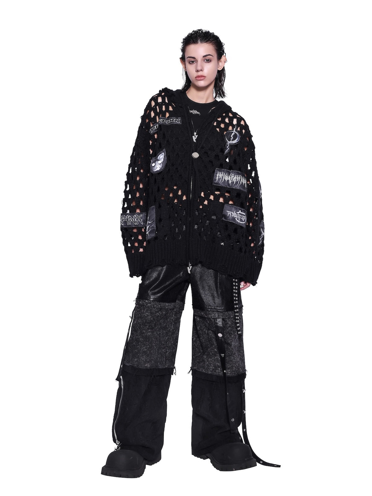パッチワークの太めのニットフーディ