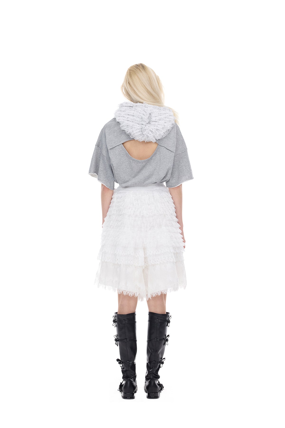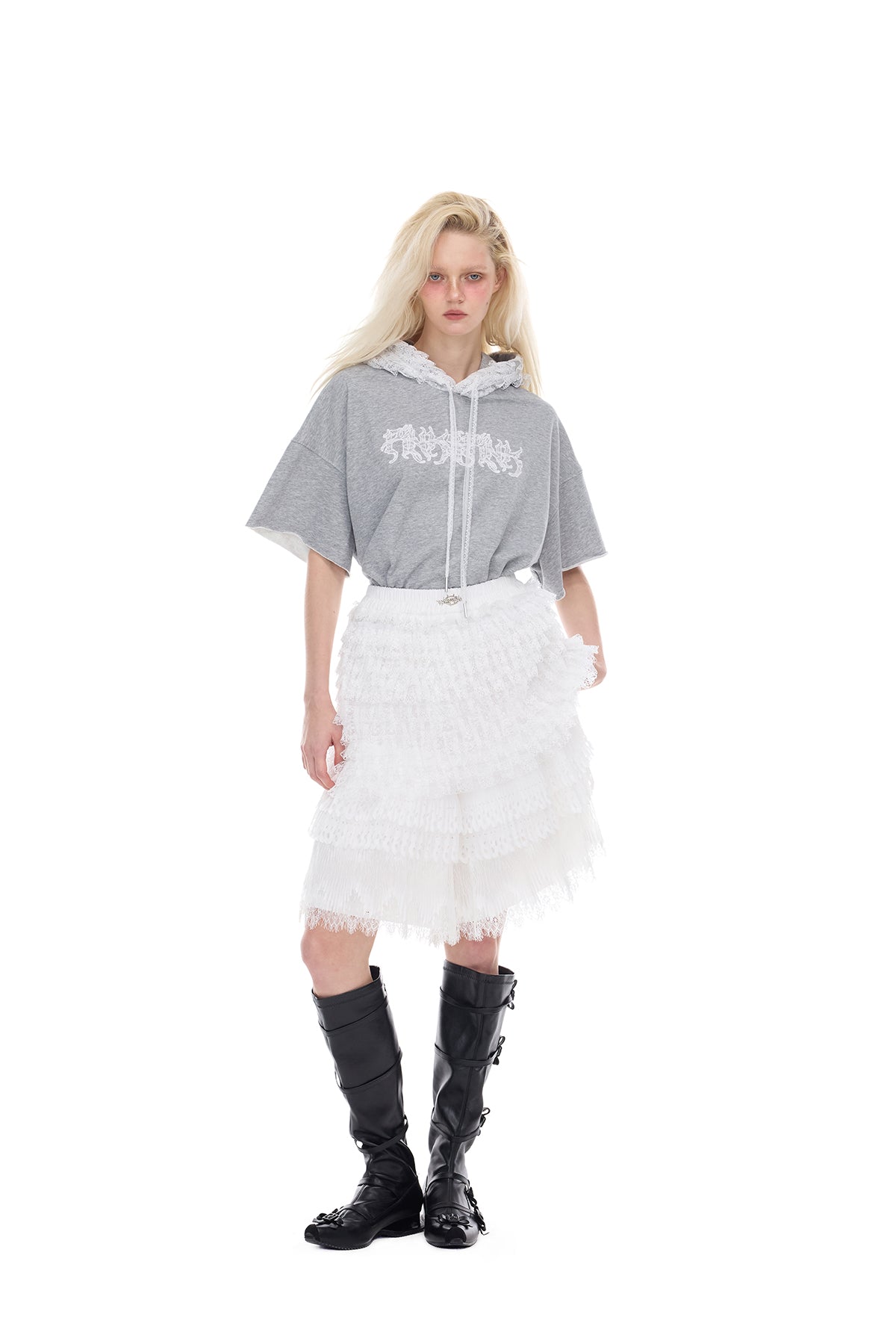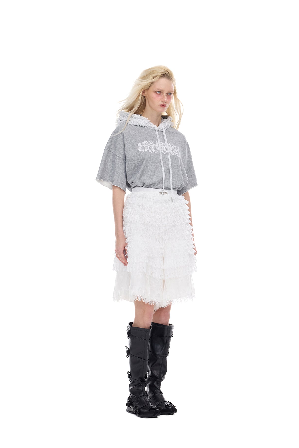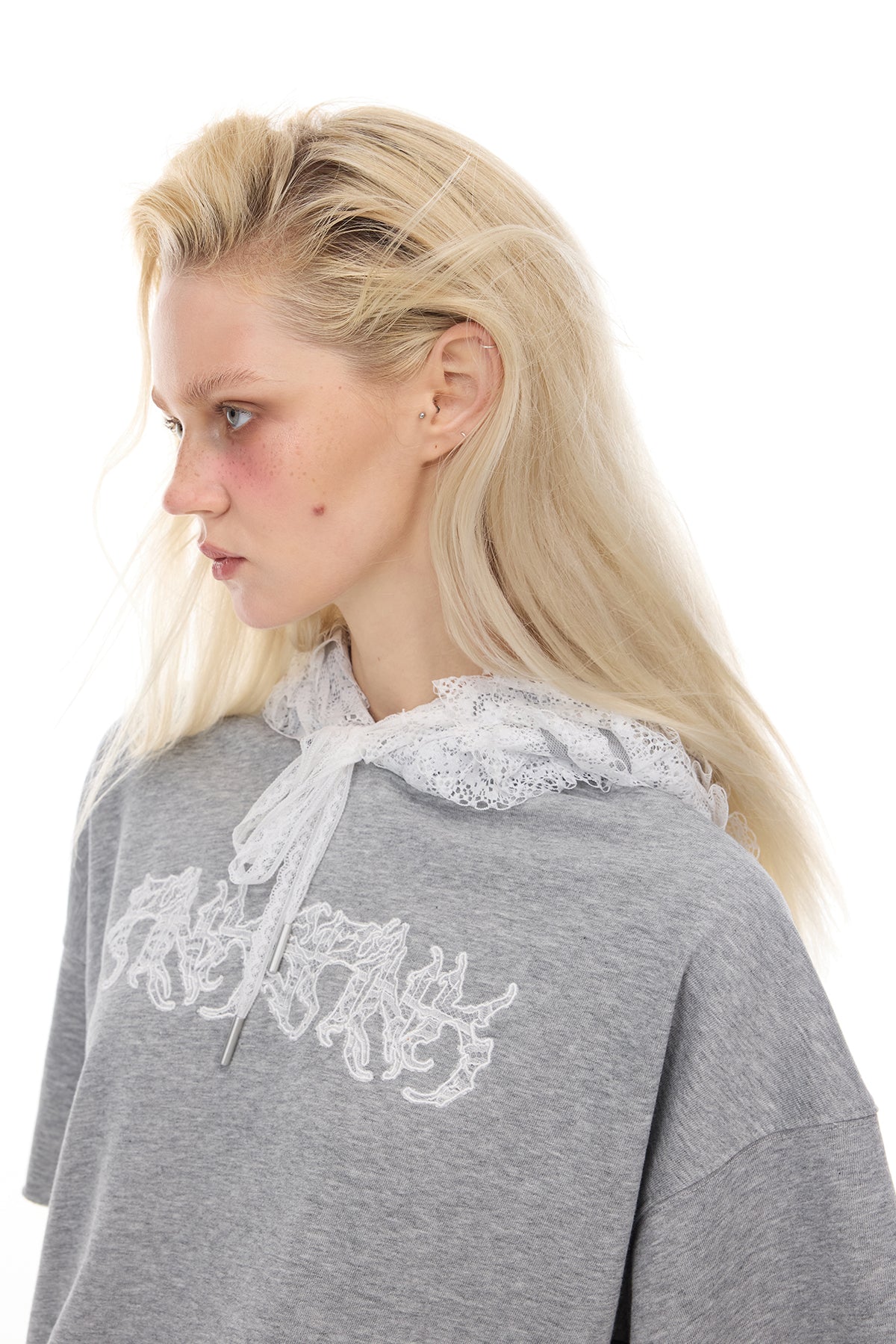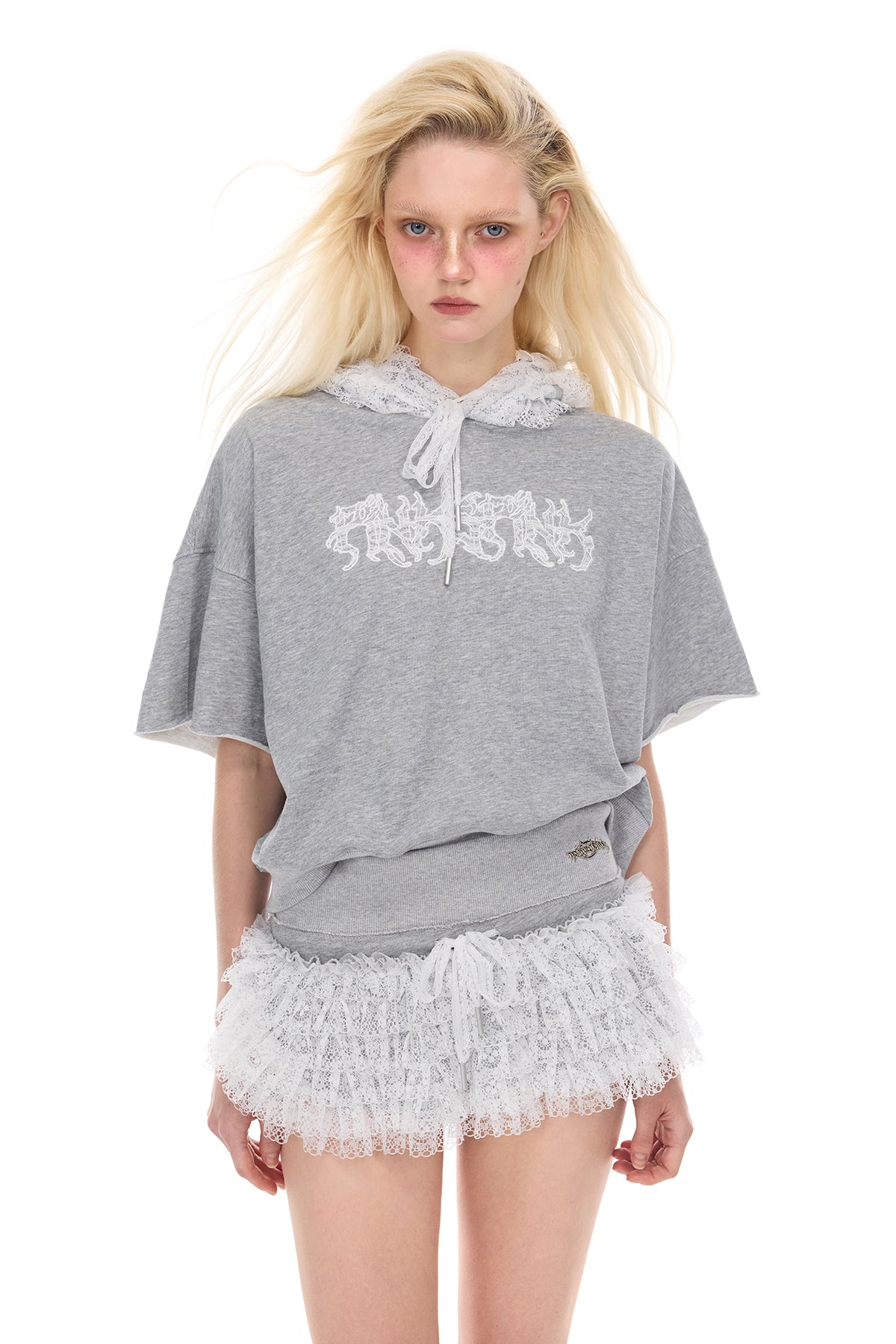 - レイヤードレースパネルとレースドローストリングが施されたフード