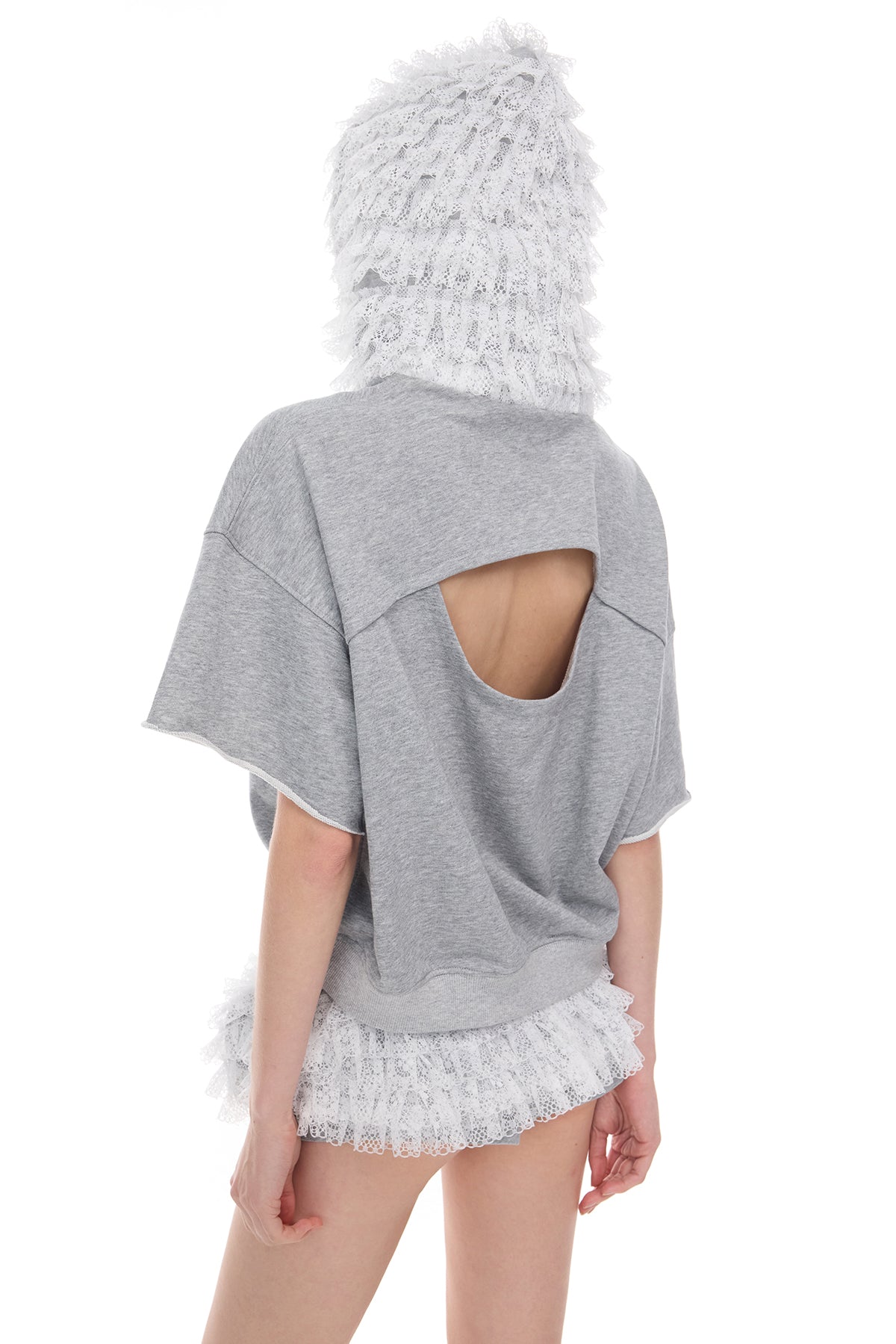 レースアクセントとオープンバックデザインのリラックスフィットクロップドフーディ