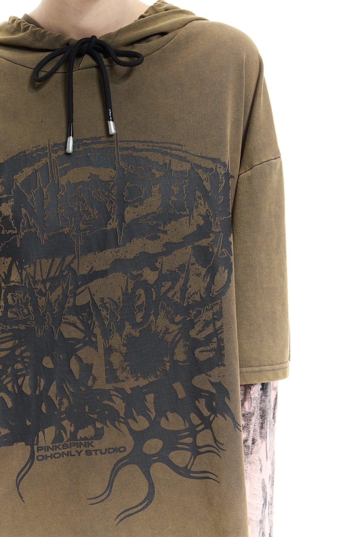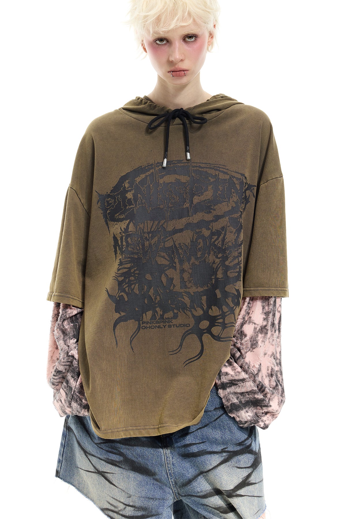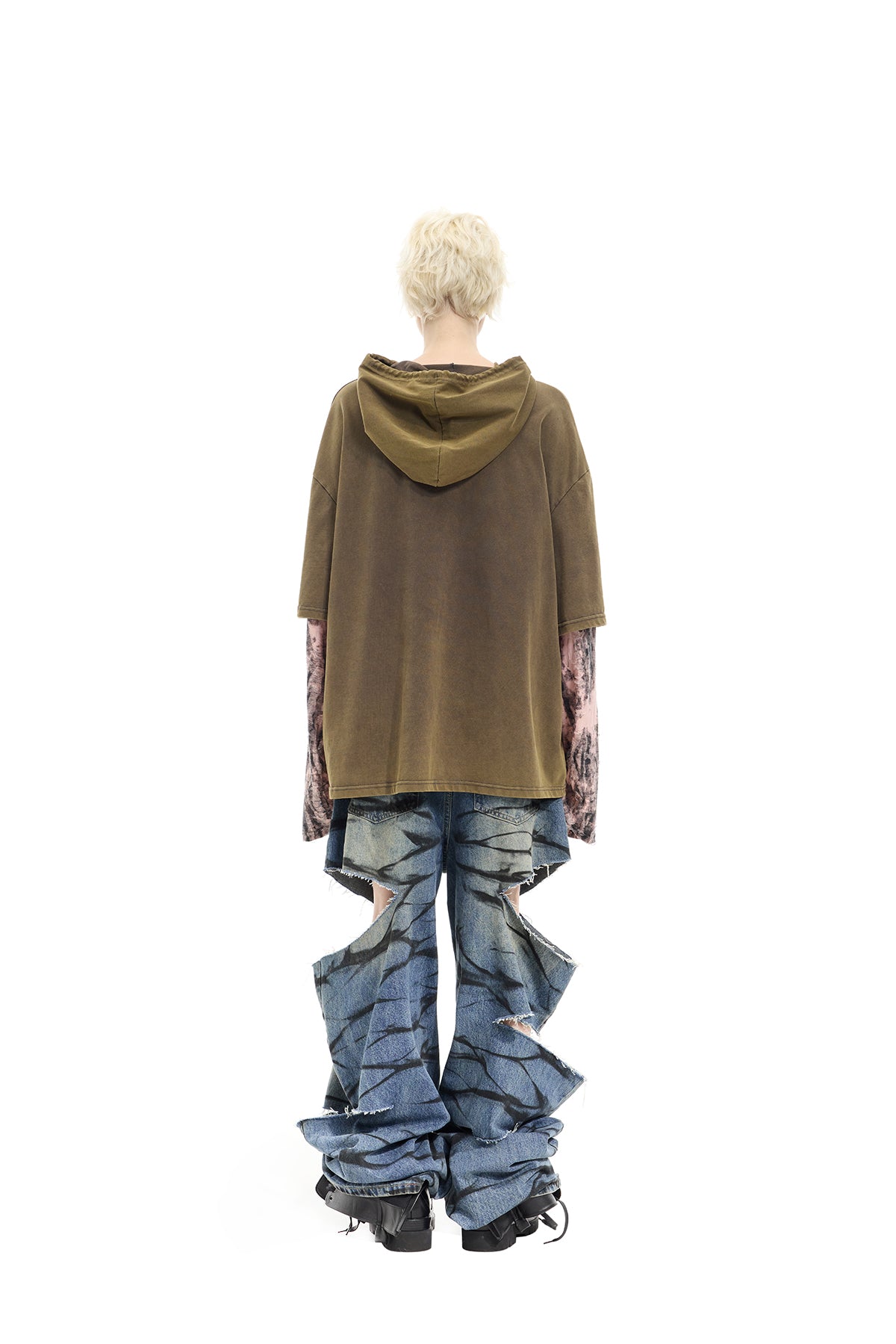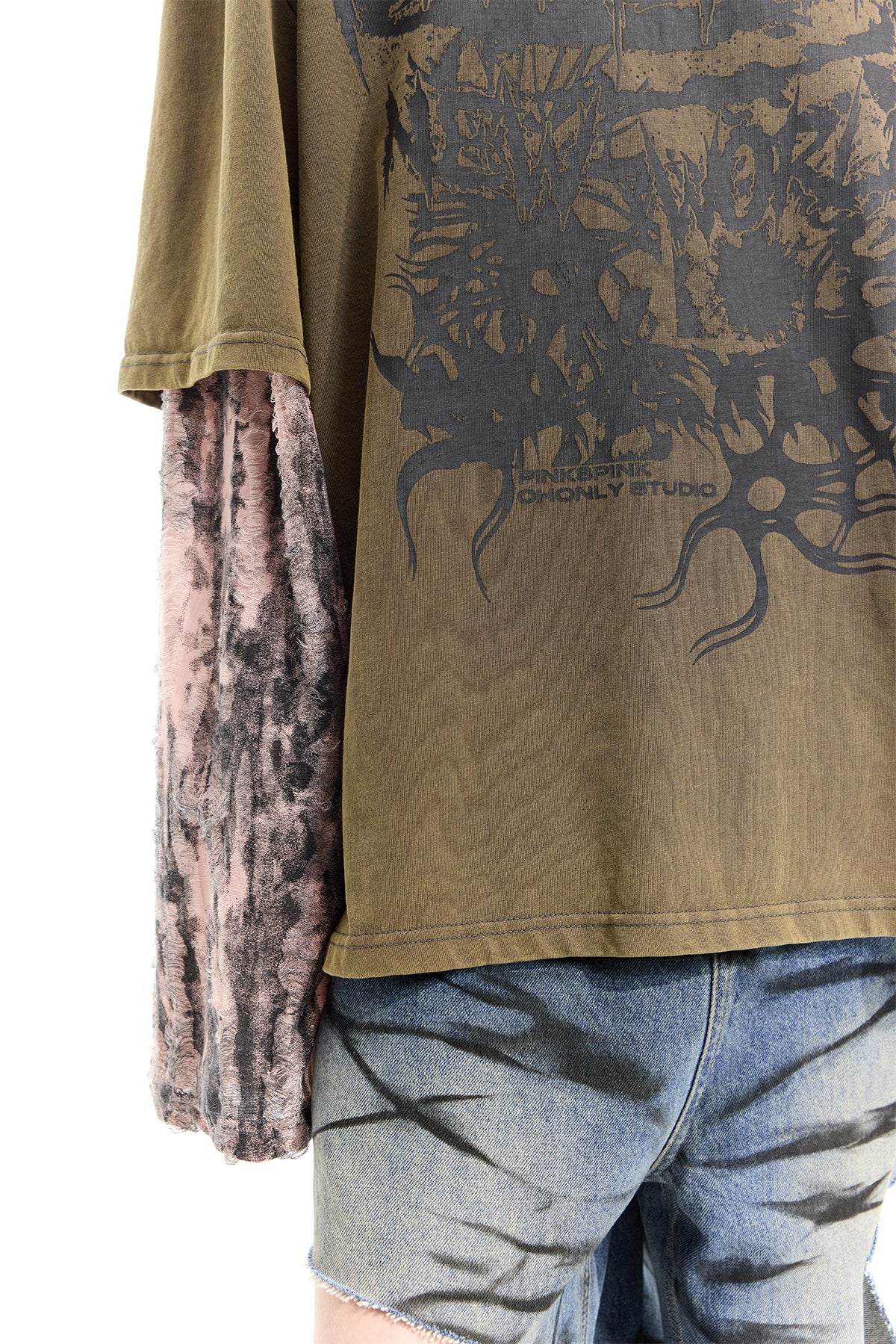 - ダブルレイヤーの袖にダメージ加工されたピンクグレーの生地