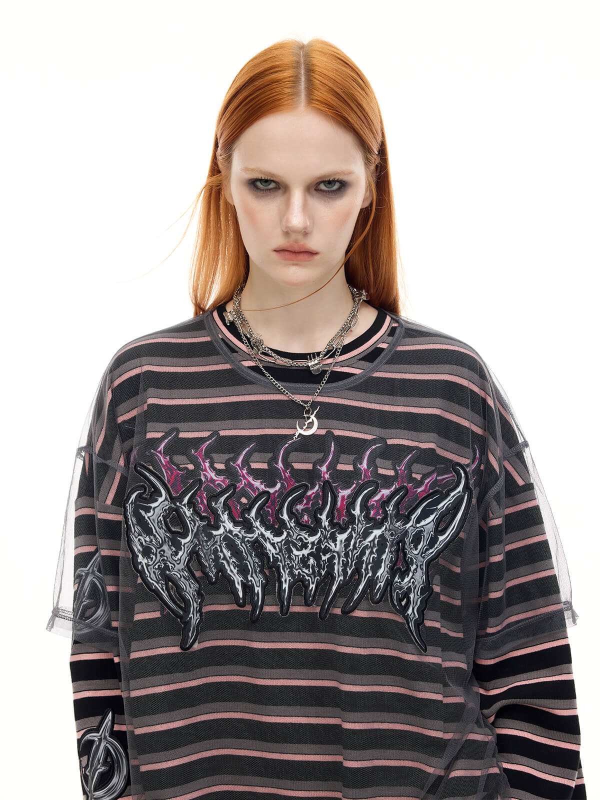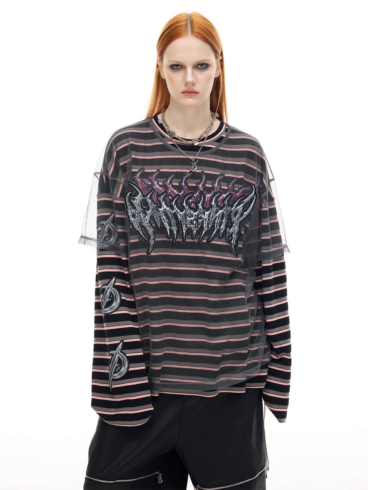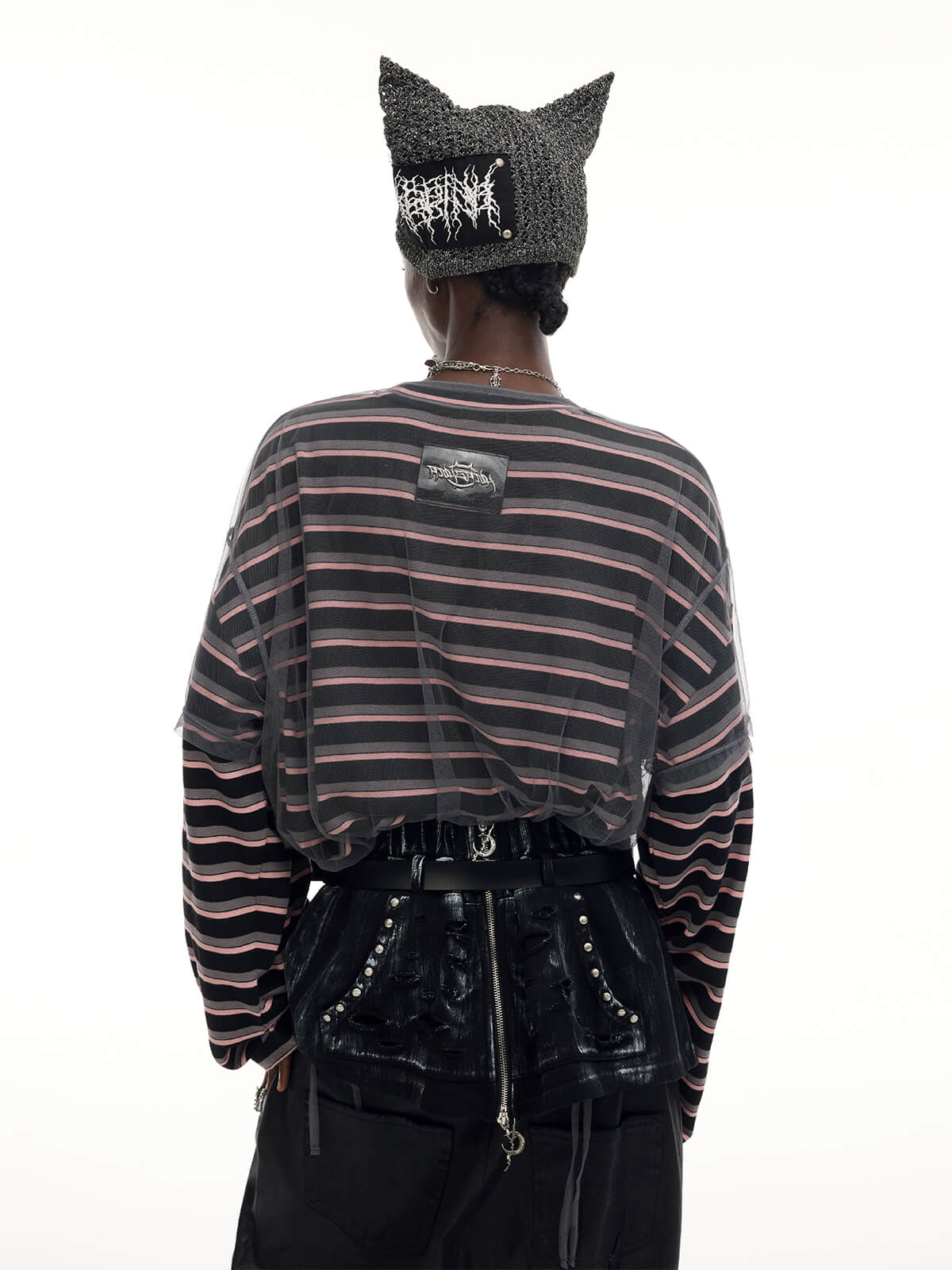 取り外し可能なメッシュオーバーレイ付きの長袖ストライプTシャツ