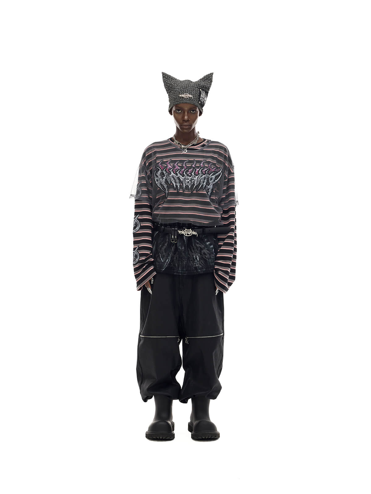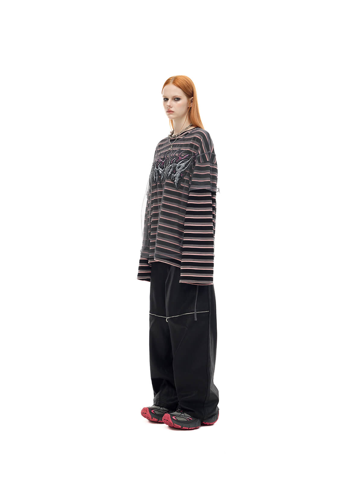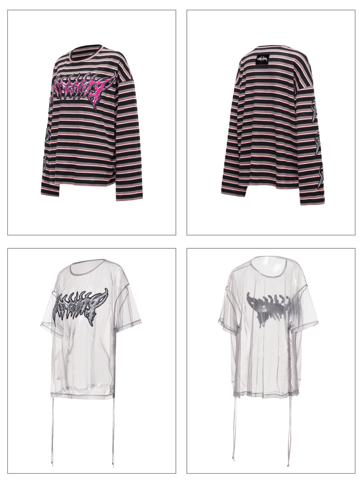 取り外し可能なメッシュオーバーレイ付きの長袖ストライプTシャツ