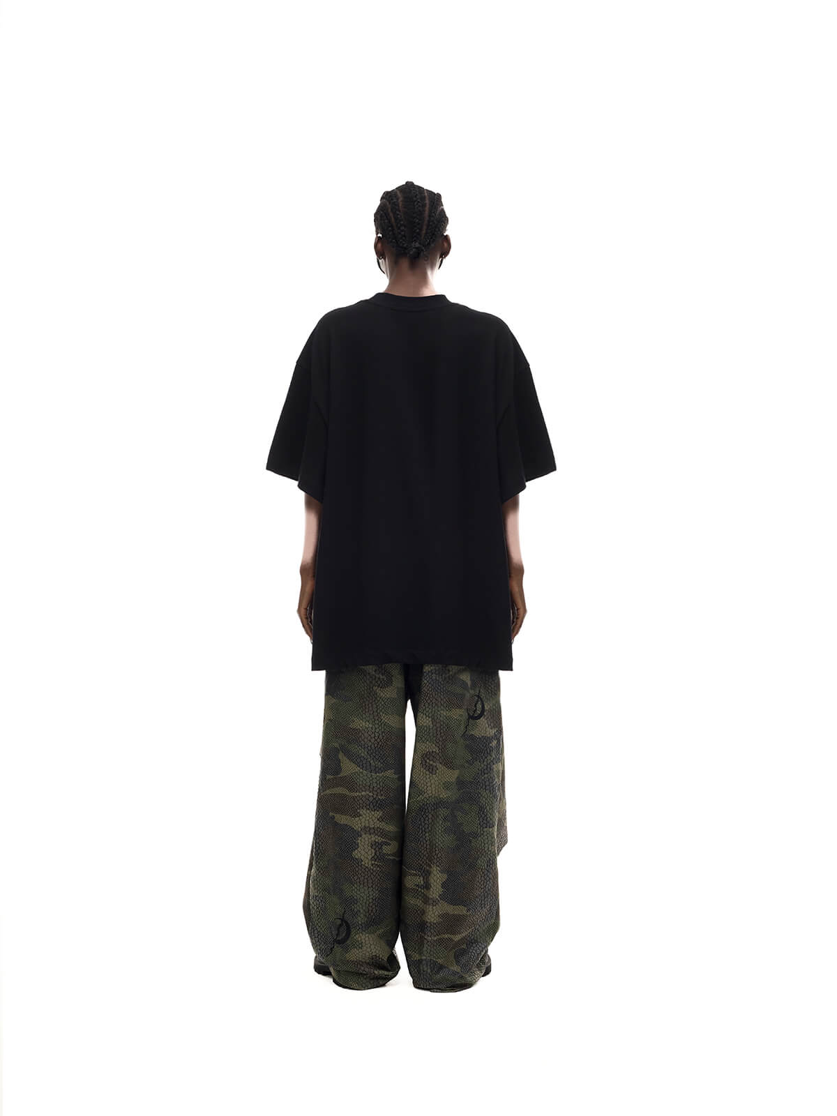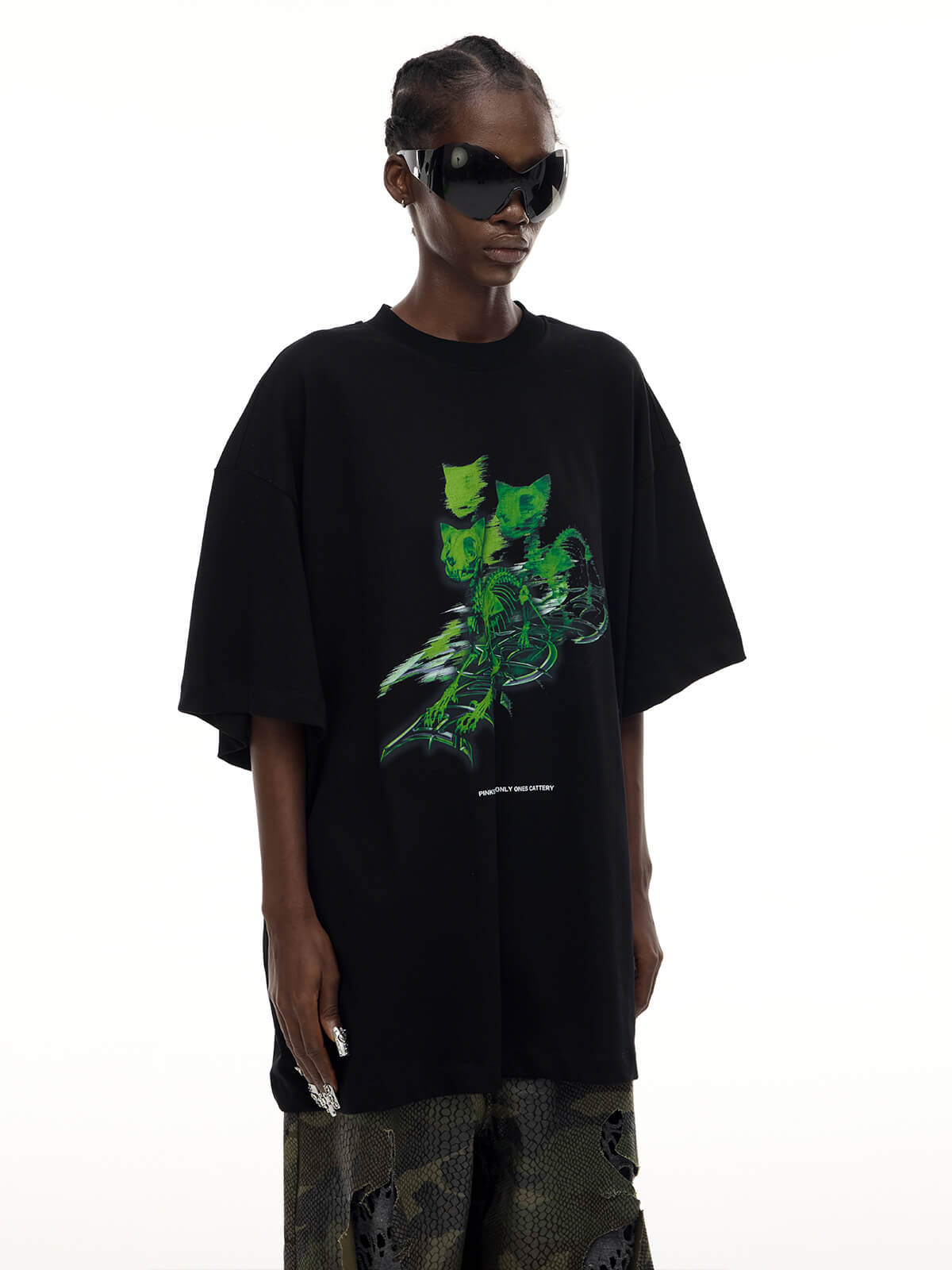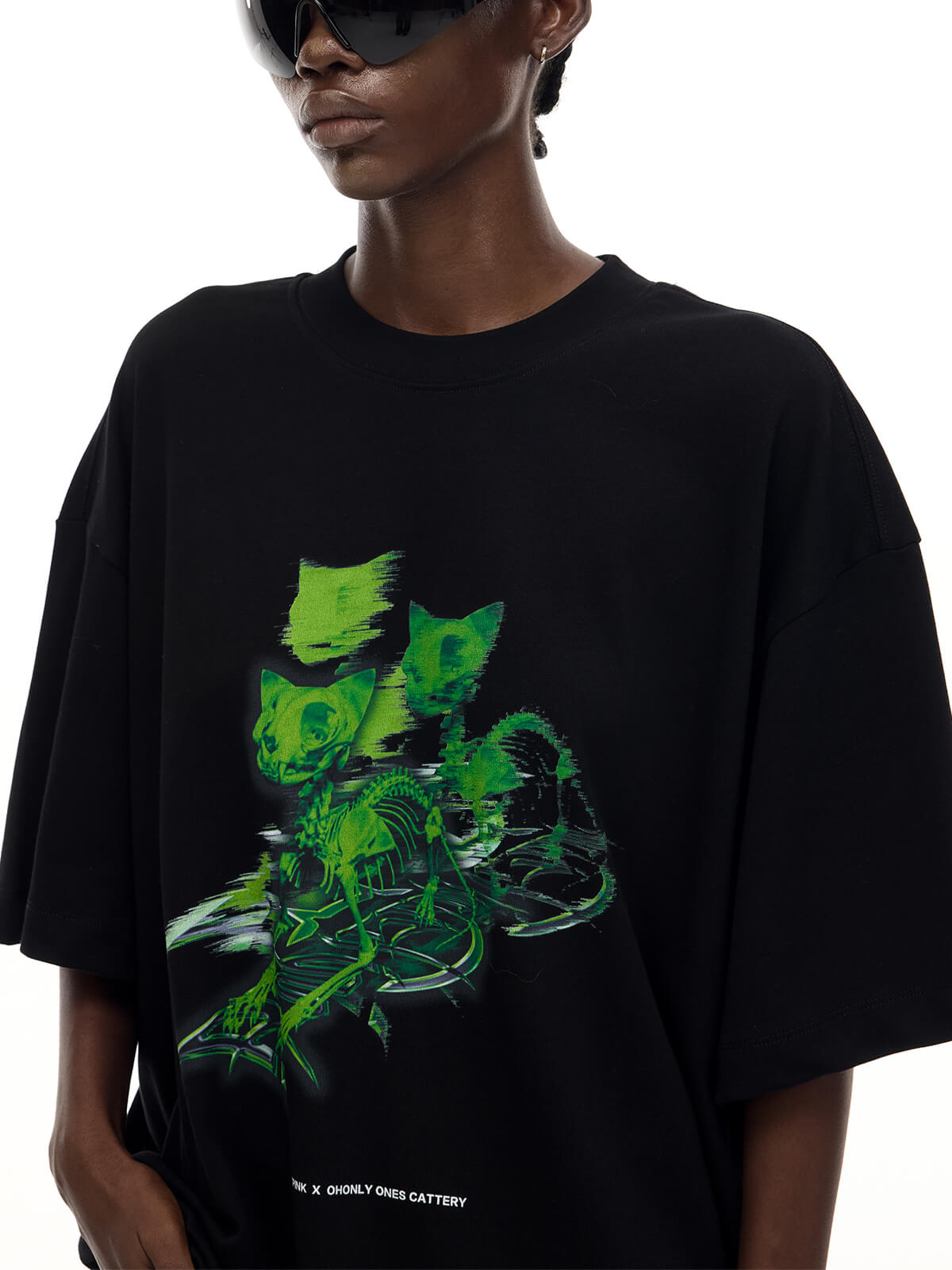 未来的なスケルトンキャットプリントのオーバーサイズ黒Tシャツ