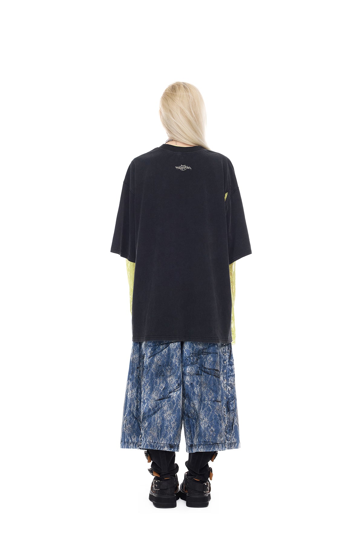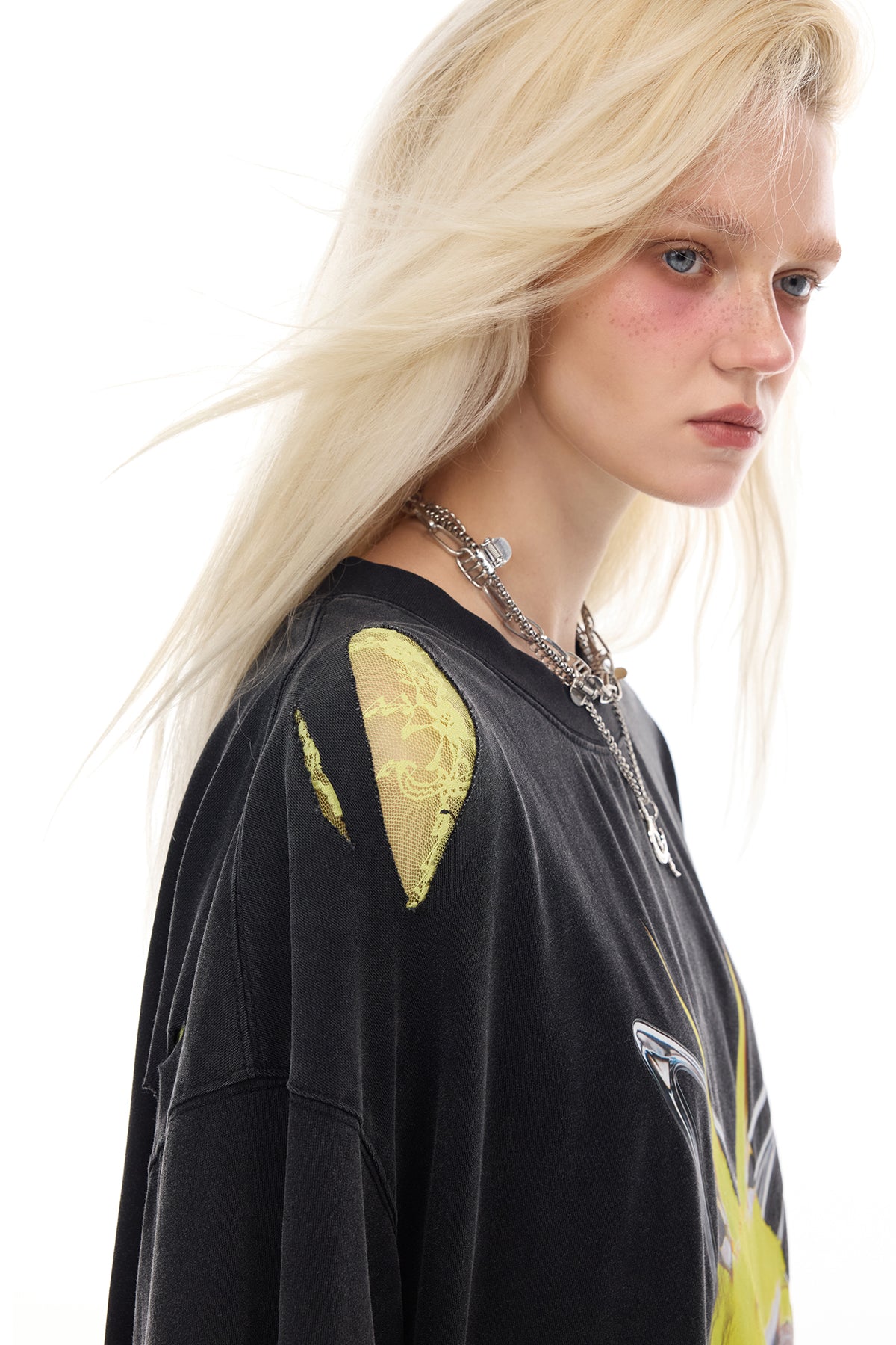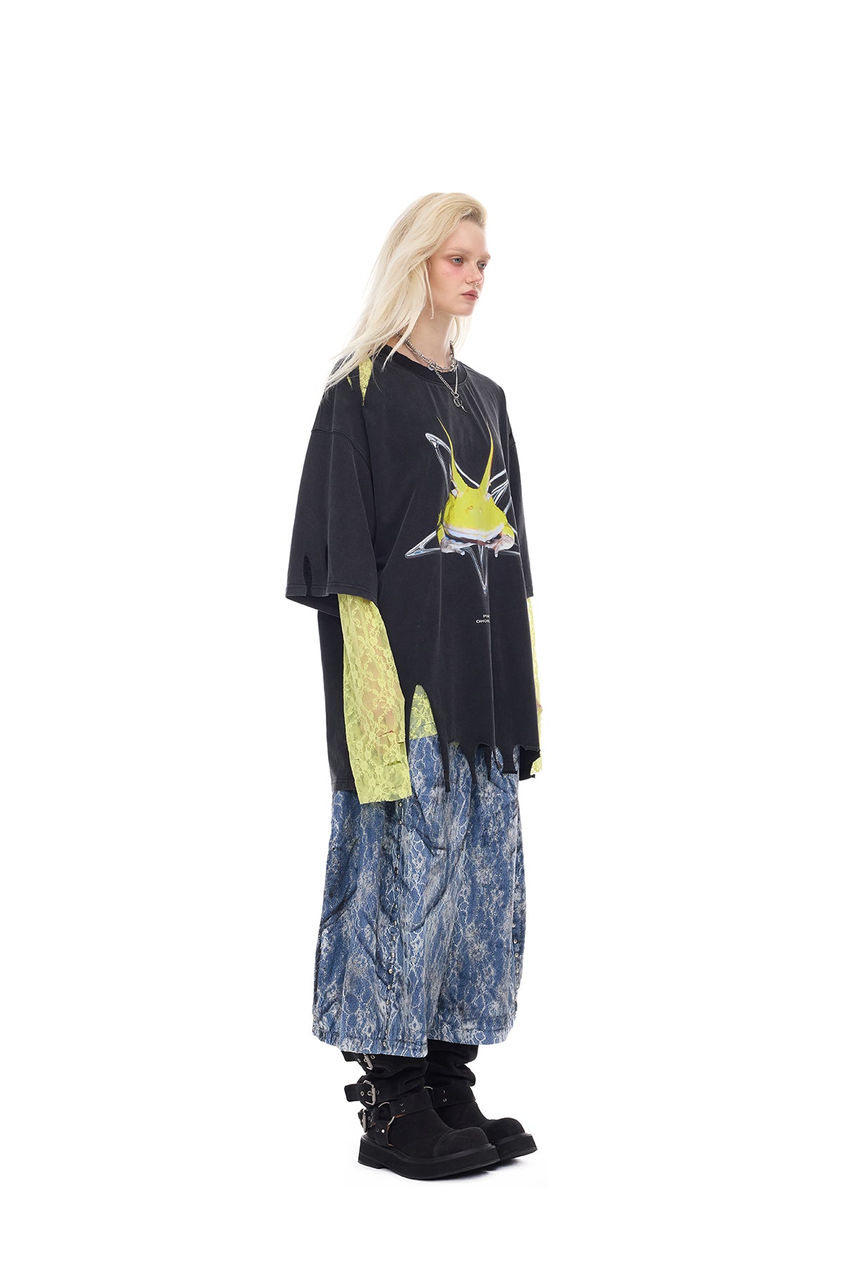 - 生地の切りっぱなしの袖とダメージ加工された肩