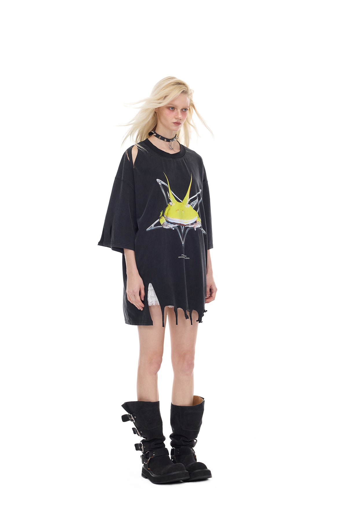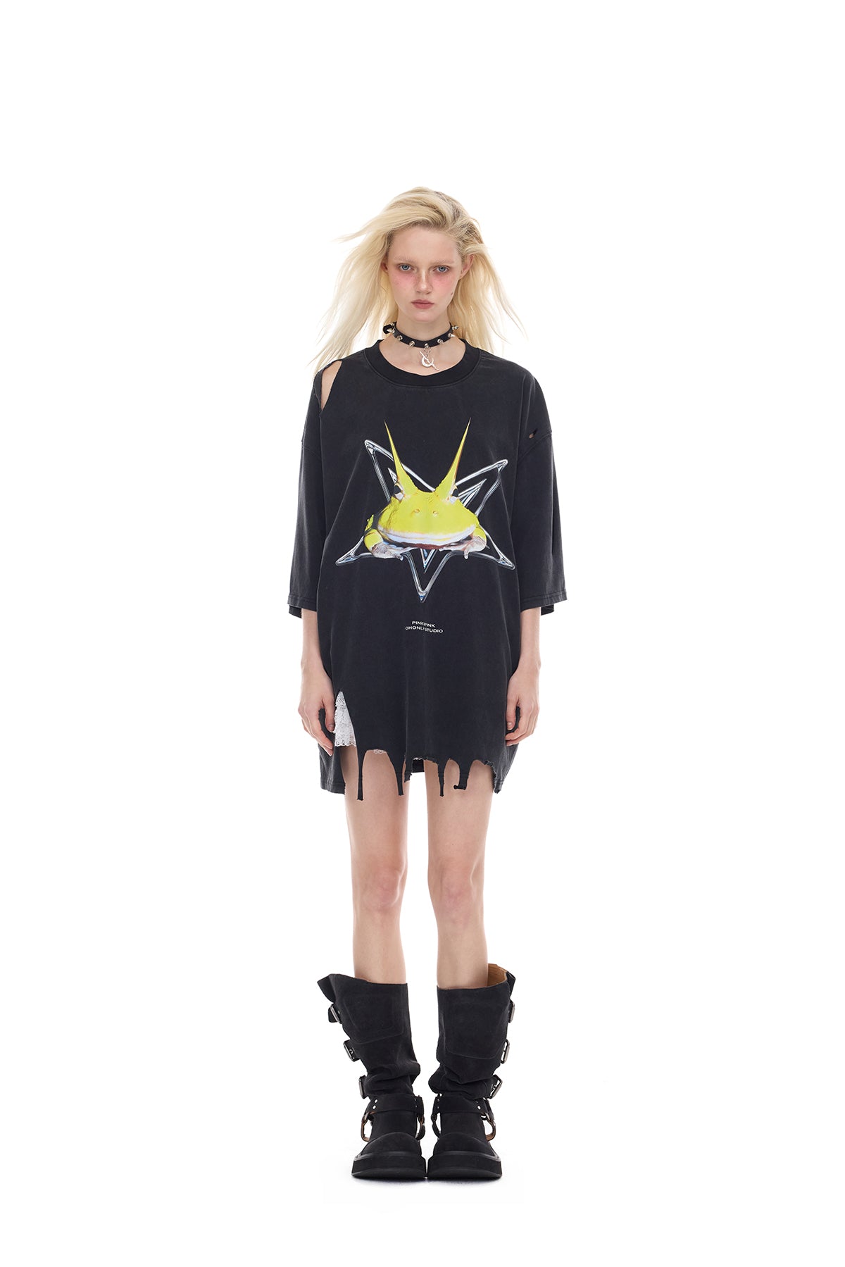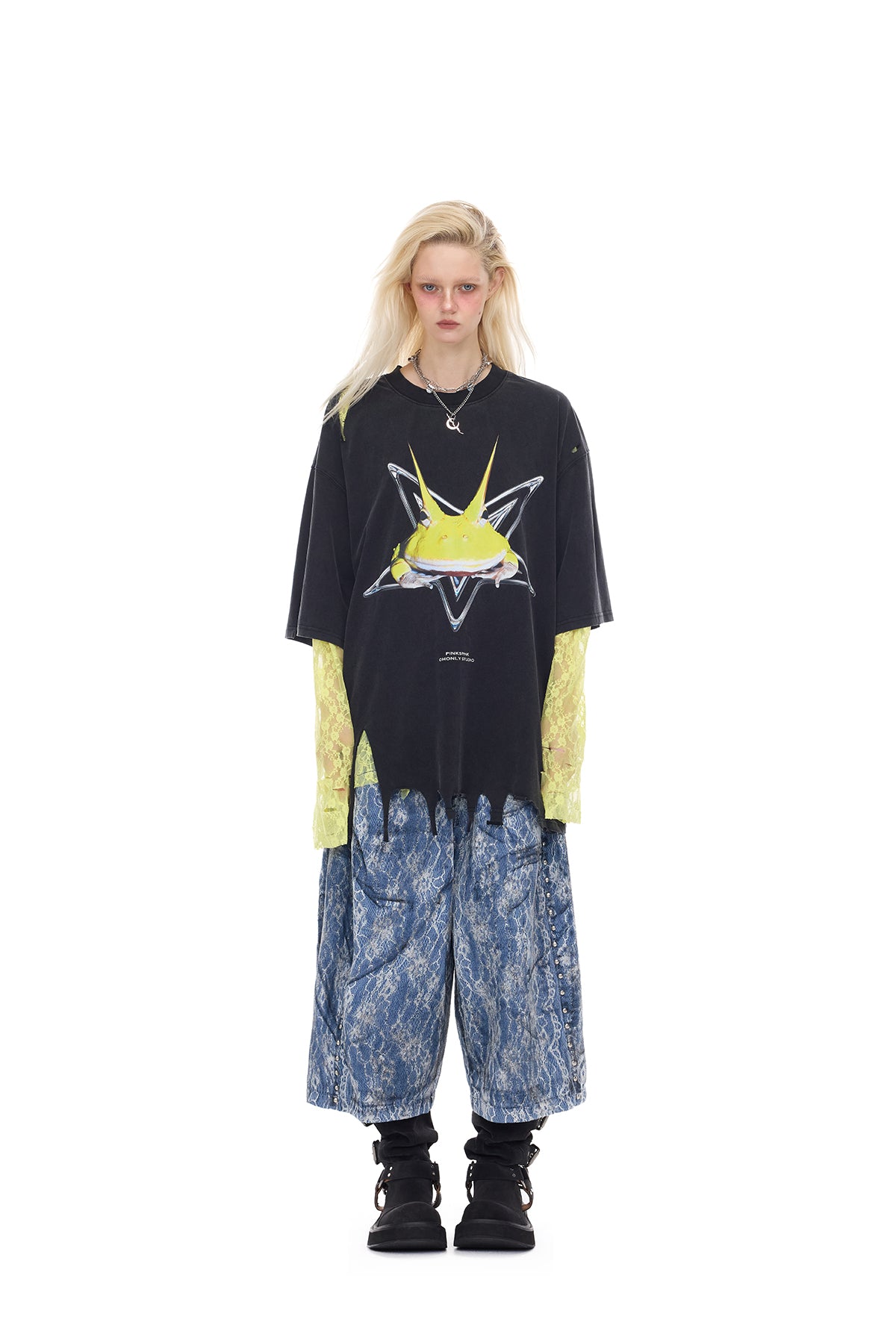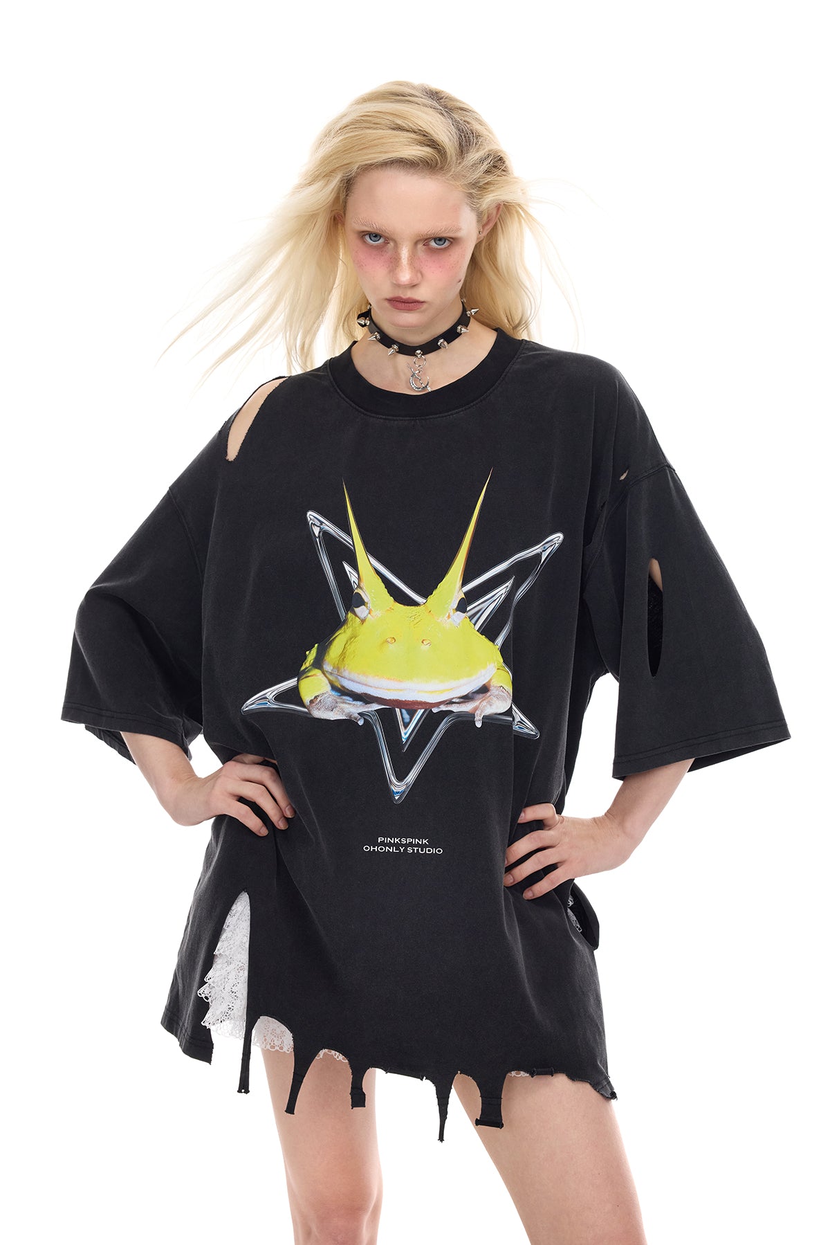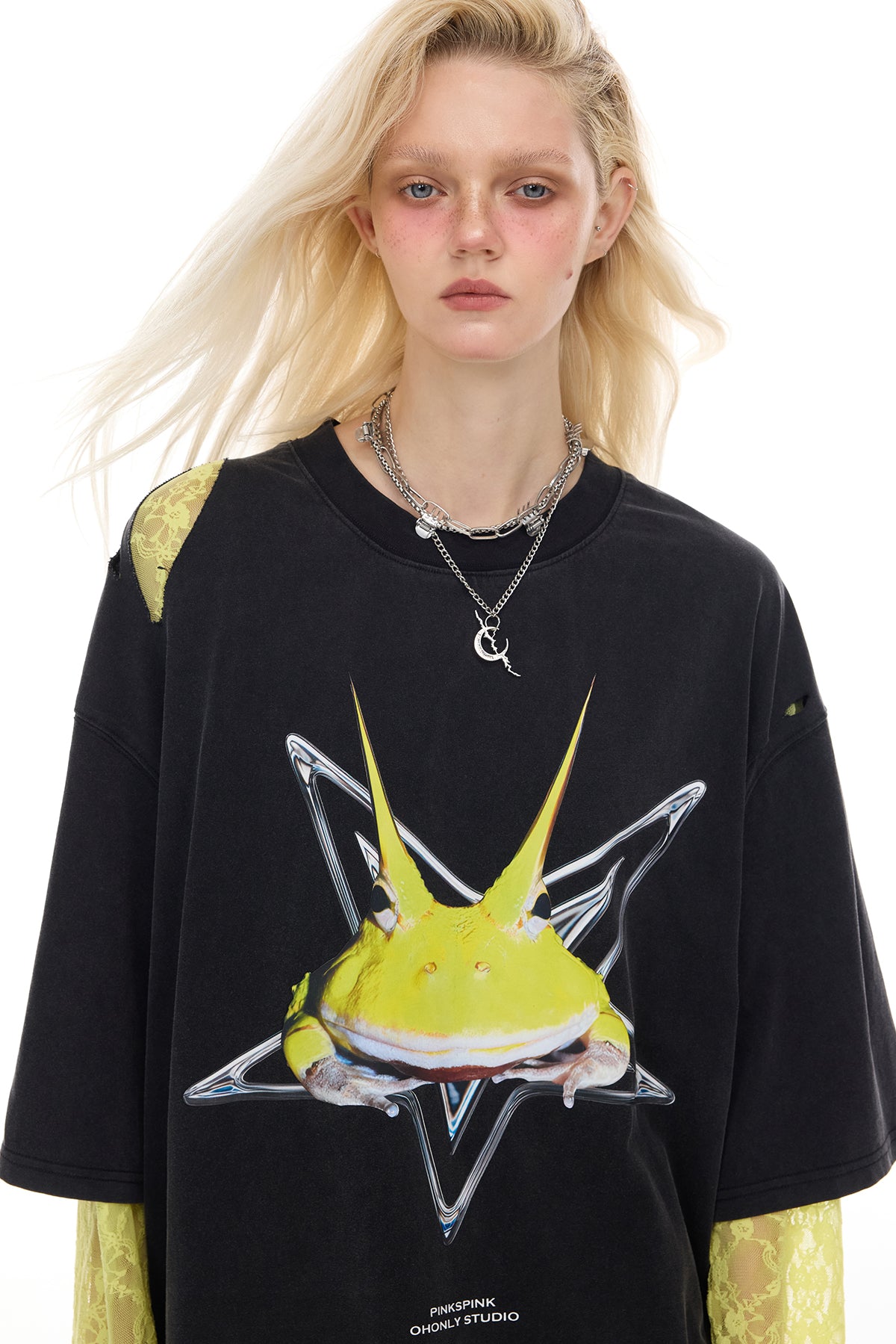 - 胸に酸性カラーの角のあるカエルのプリント