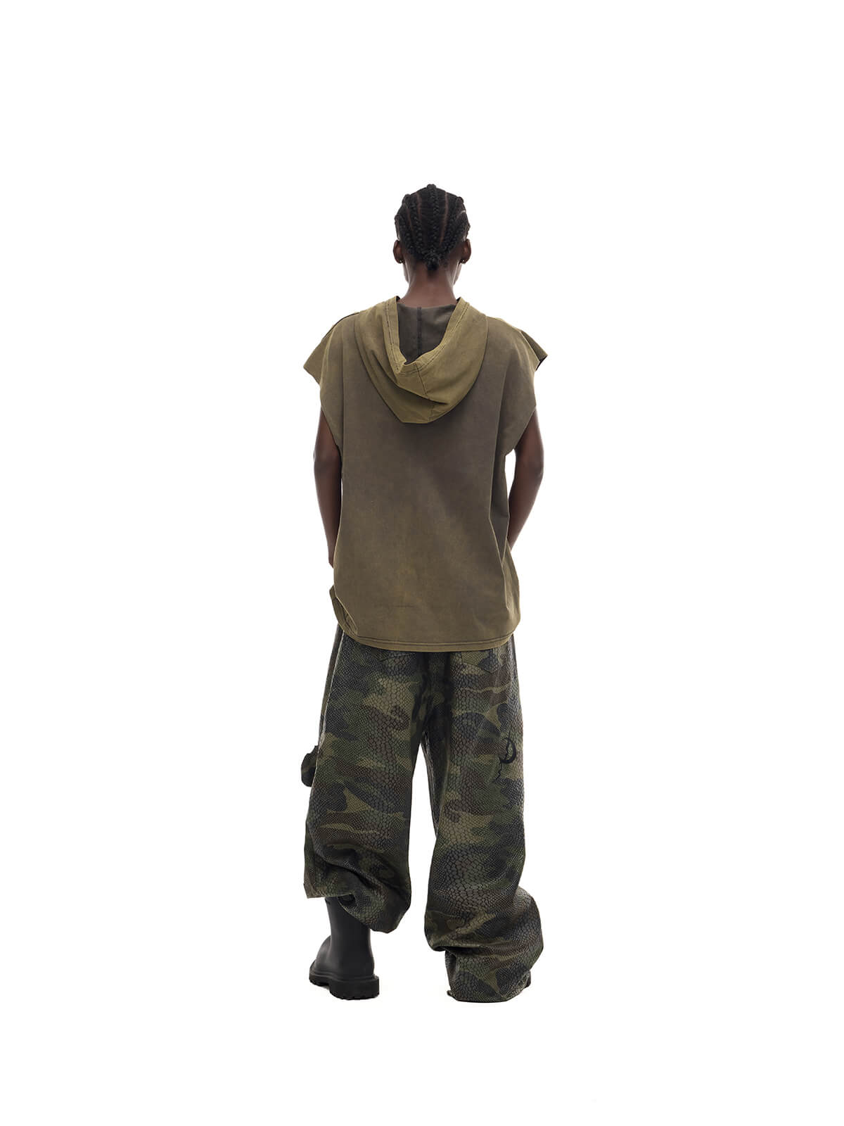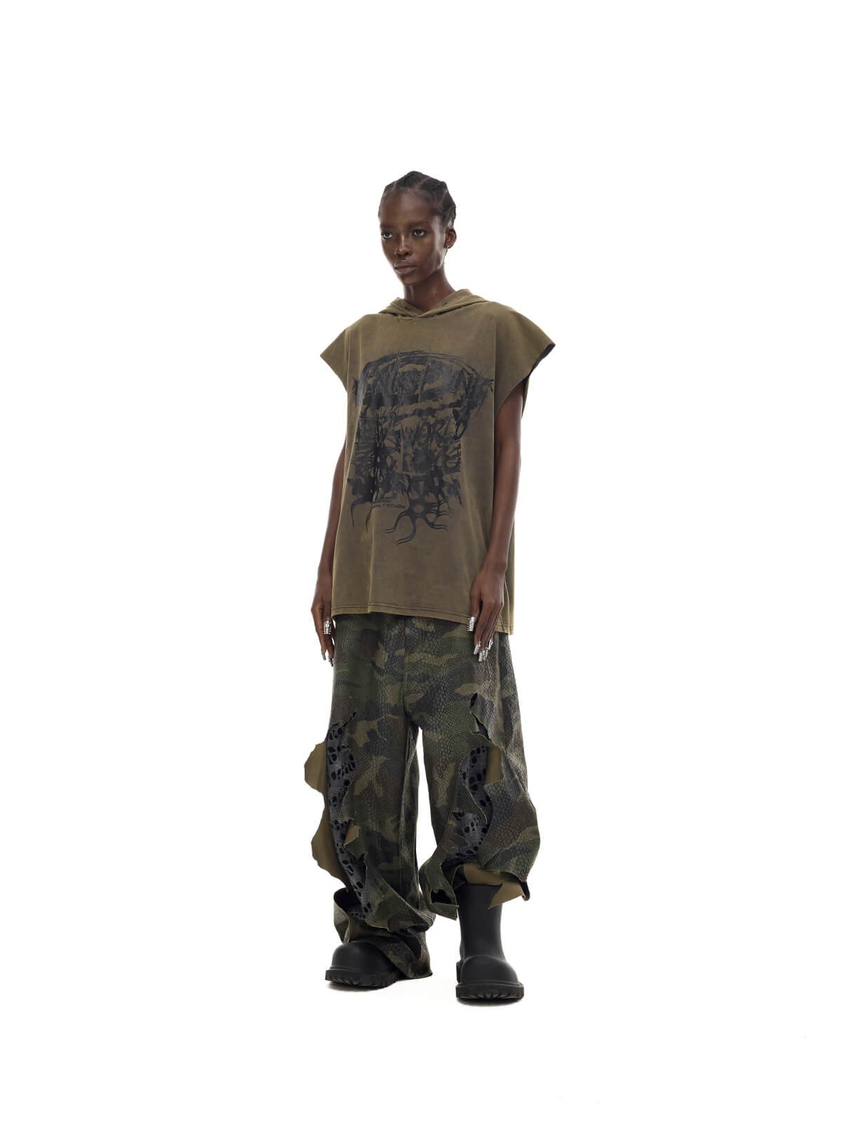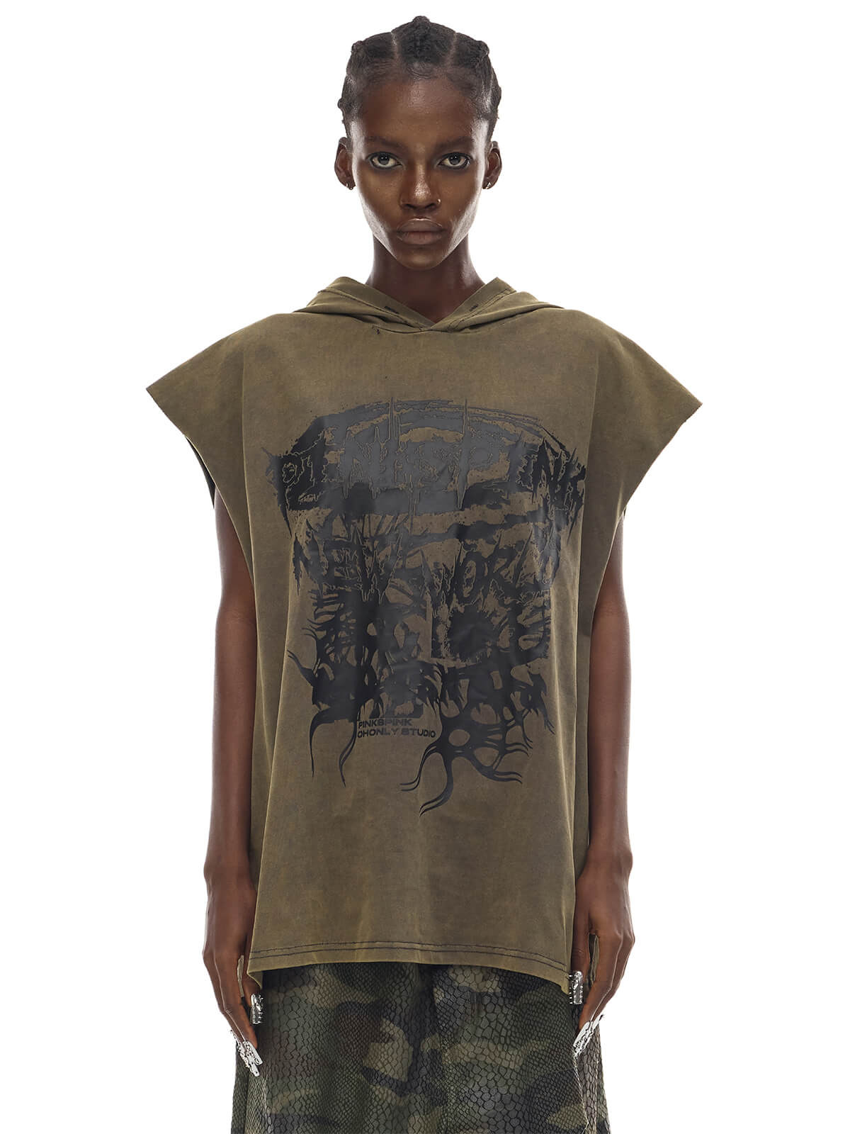 ヴィンテージ風プリントのフェードグリーンのノースリーブフード付きTシャツ