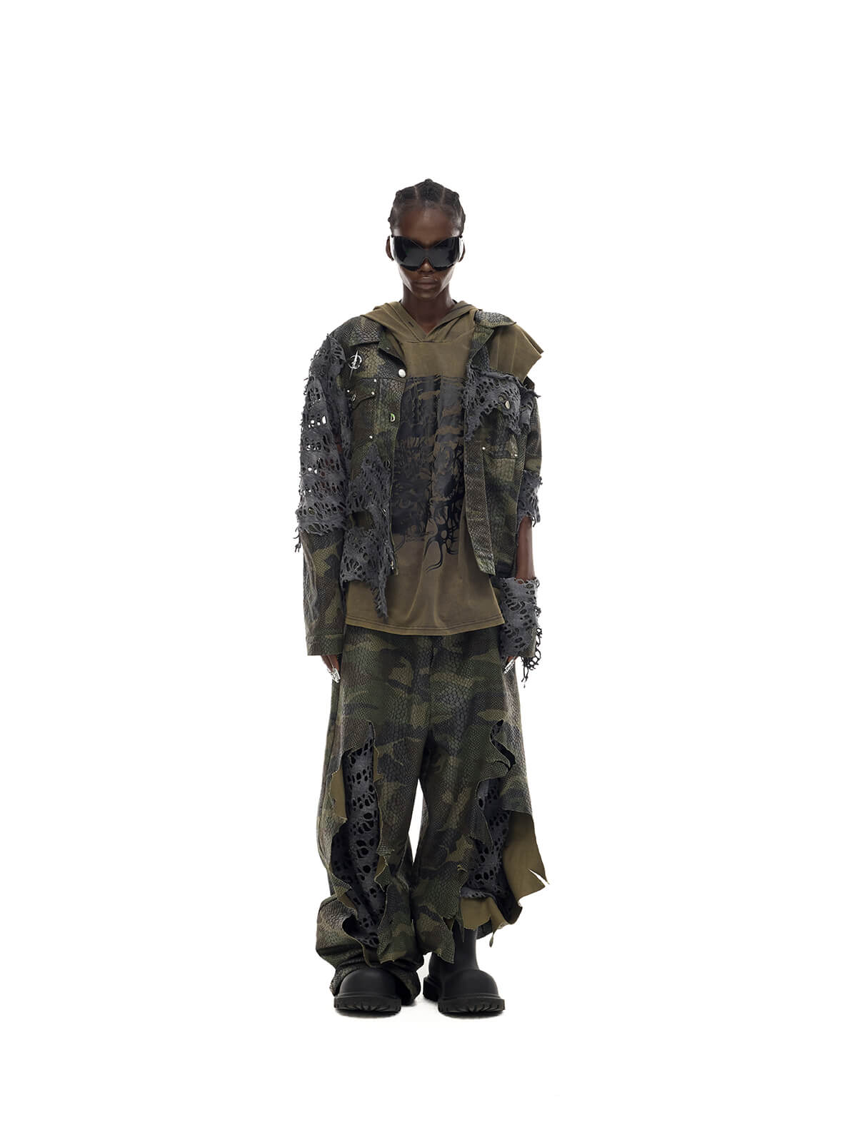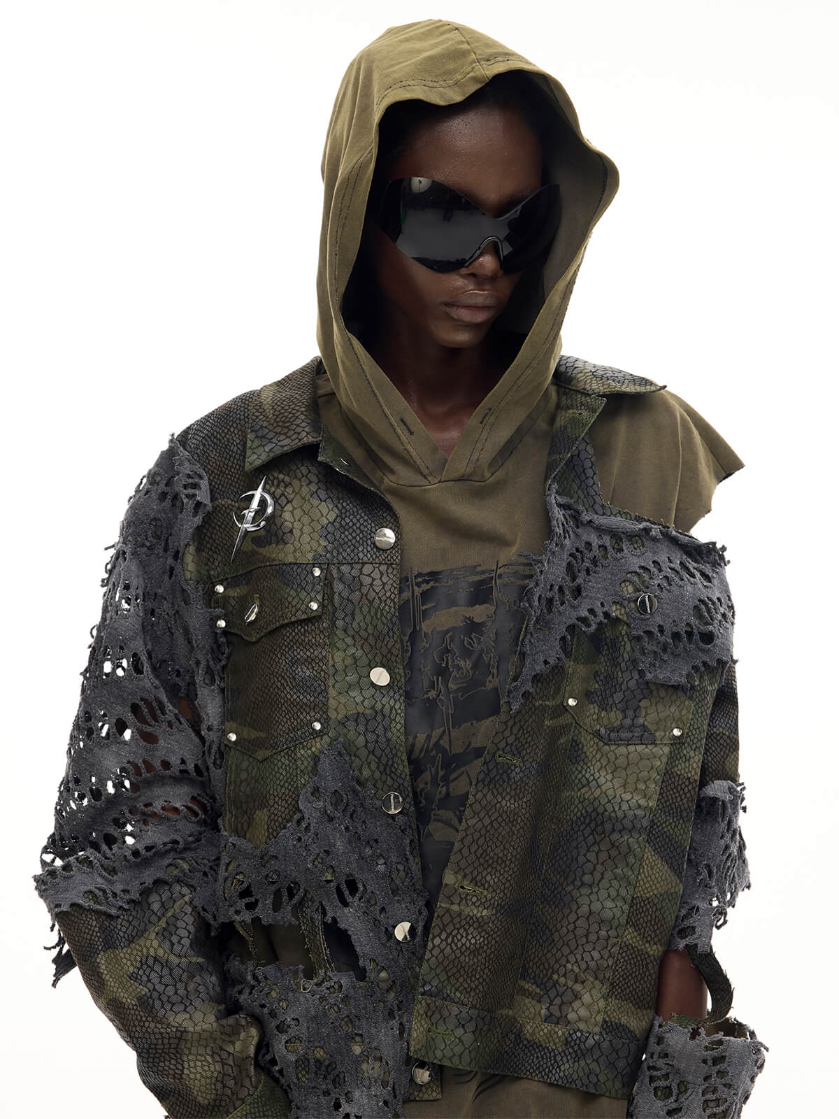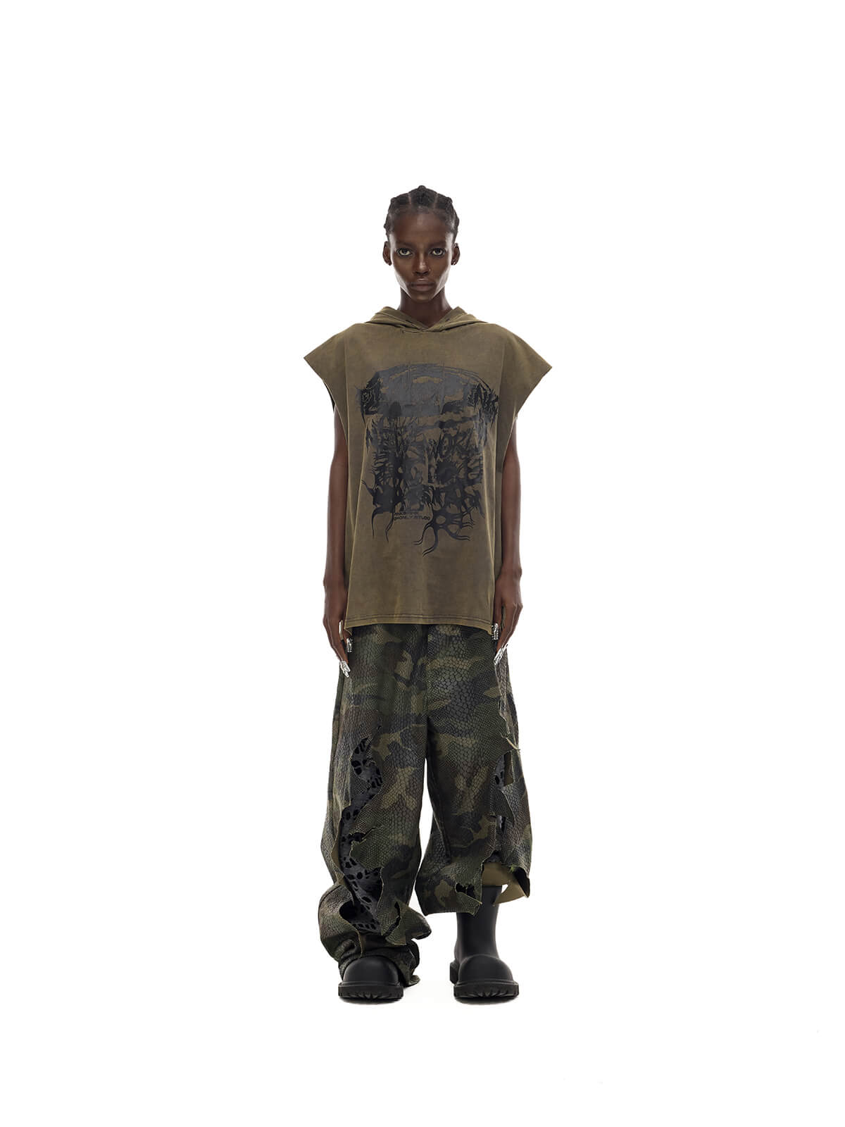 ヴィンテージ風プリントのフェードグリーンのノースリーブフード付きTシャツ